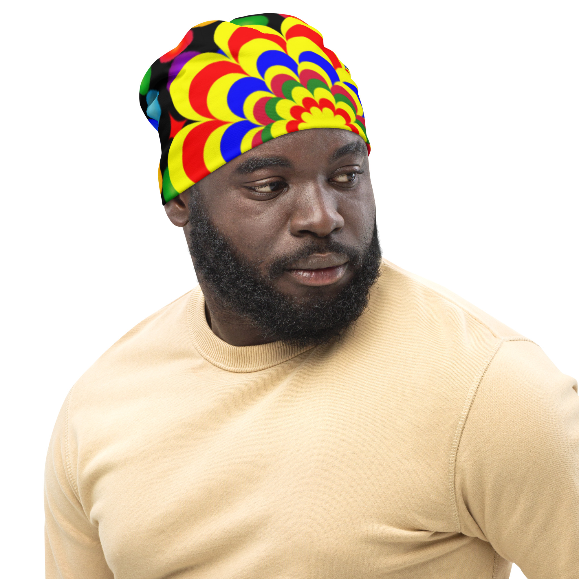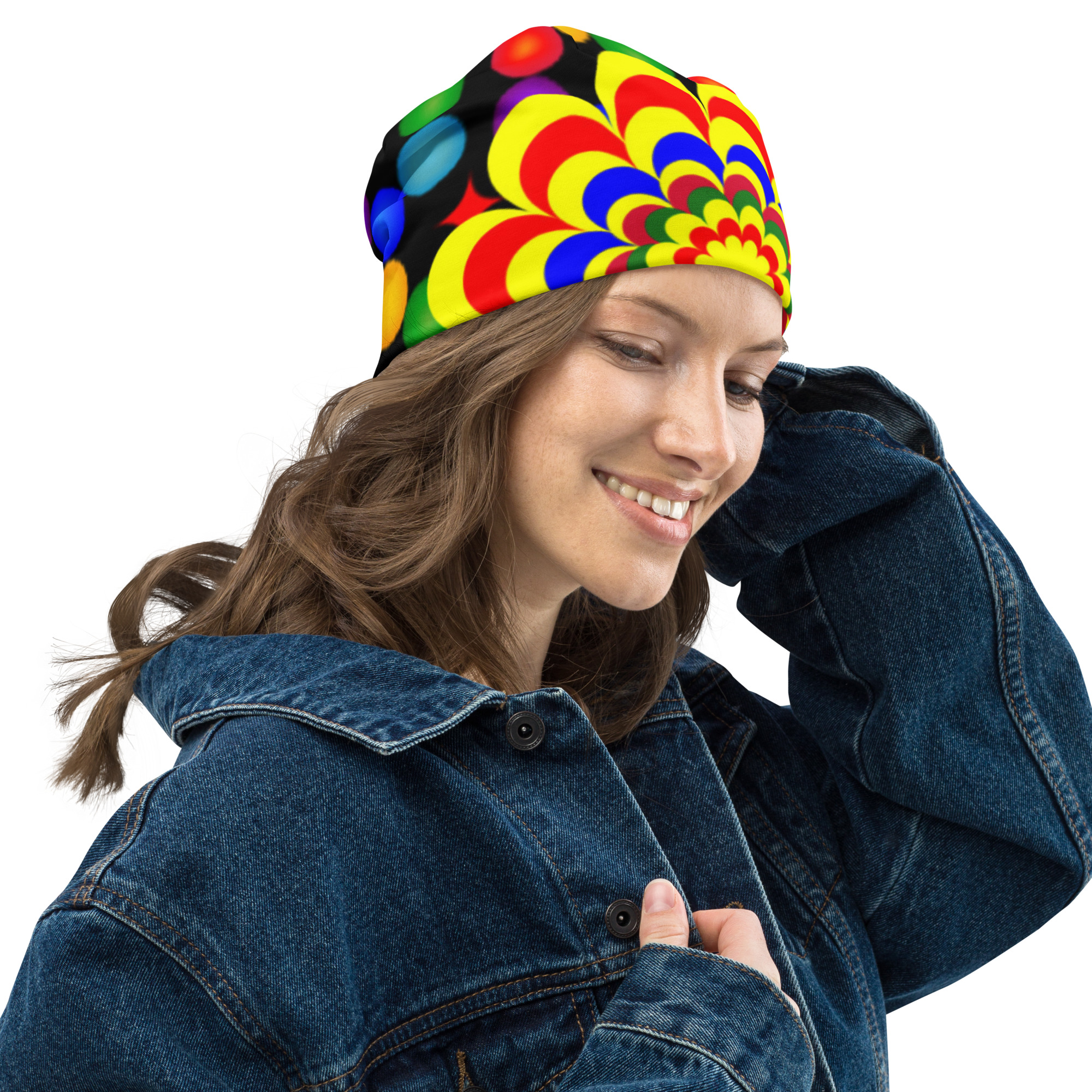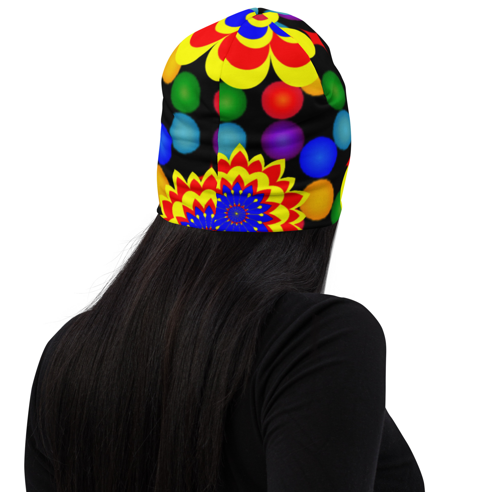This unique beanie design showcases vibrant yellow, red, and blue hues, blending playfully with stylized ball and flower patterns. The original art design adds a touch of personality and whimsy, making it perfect for anyone looking to make a statement.