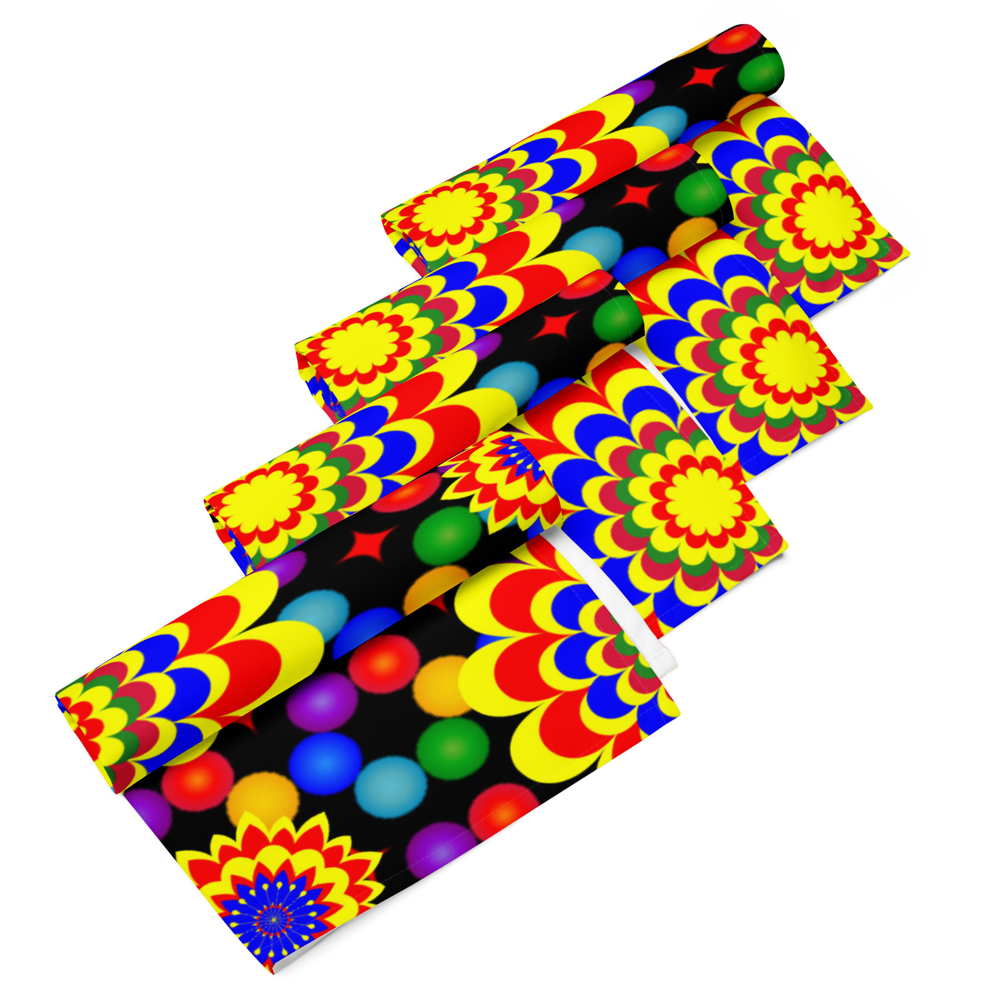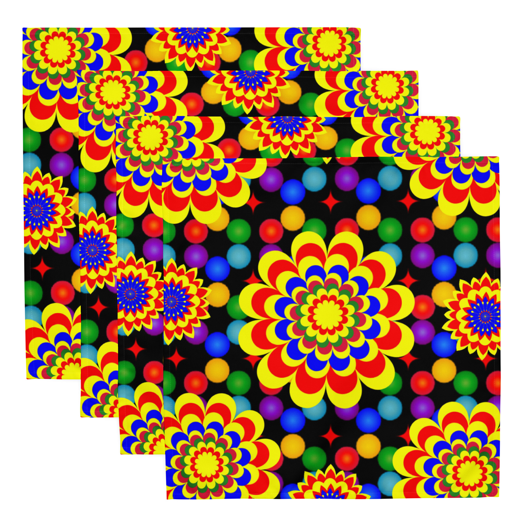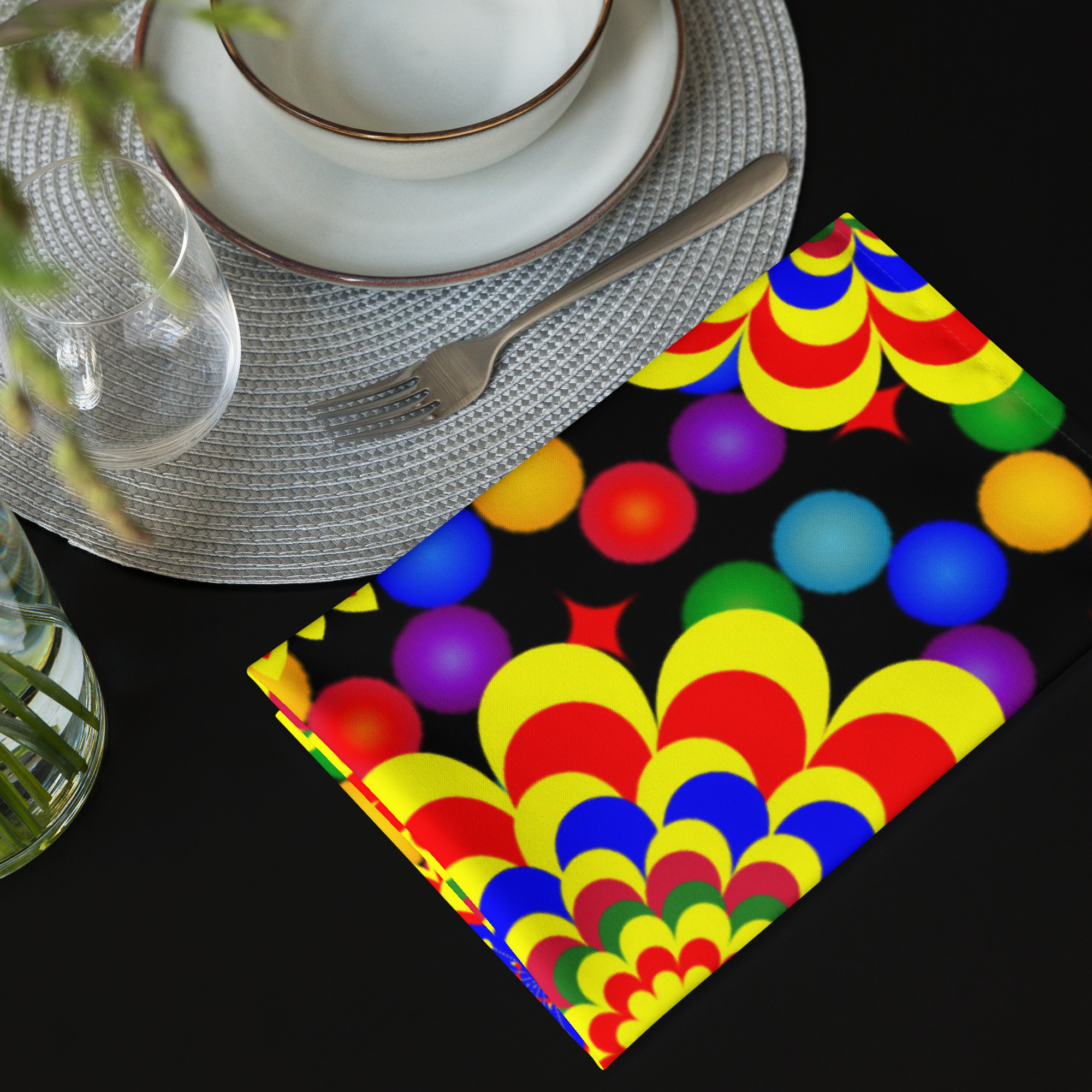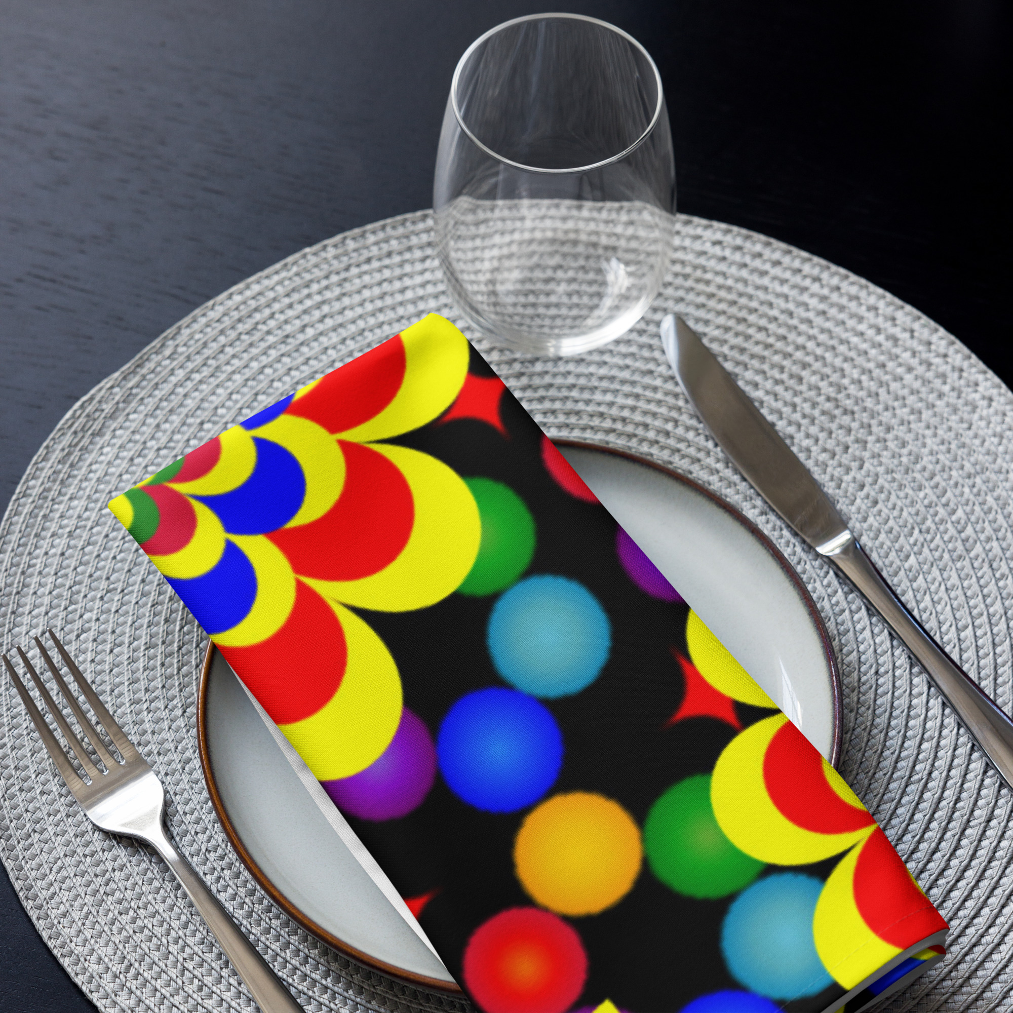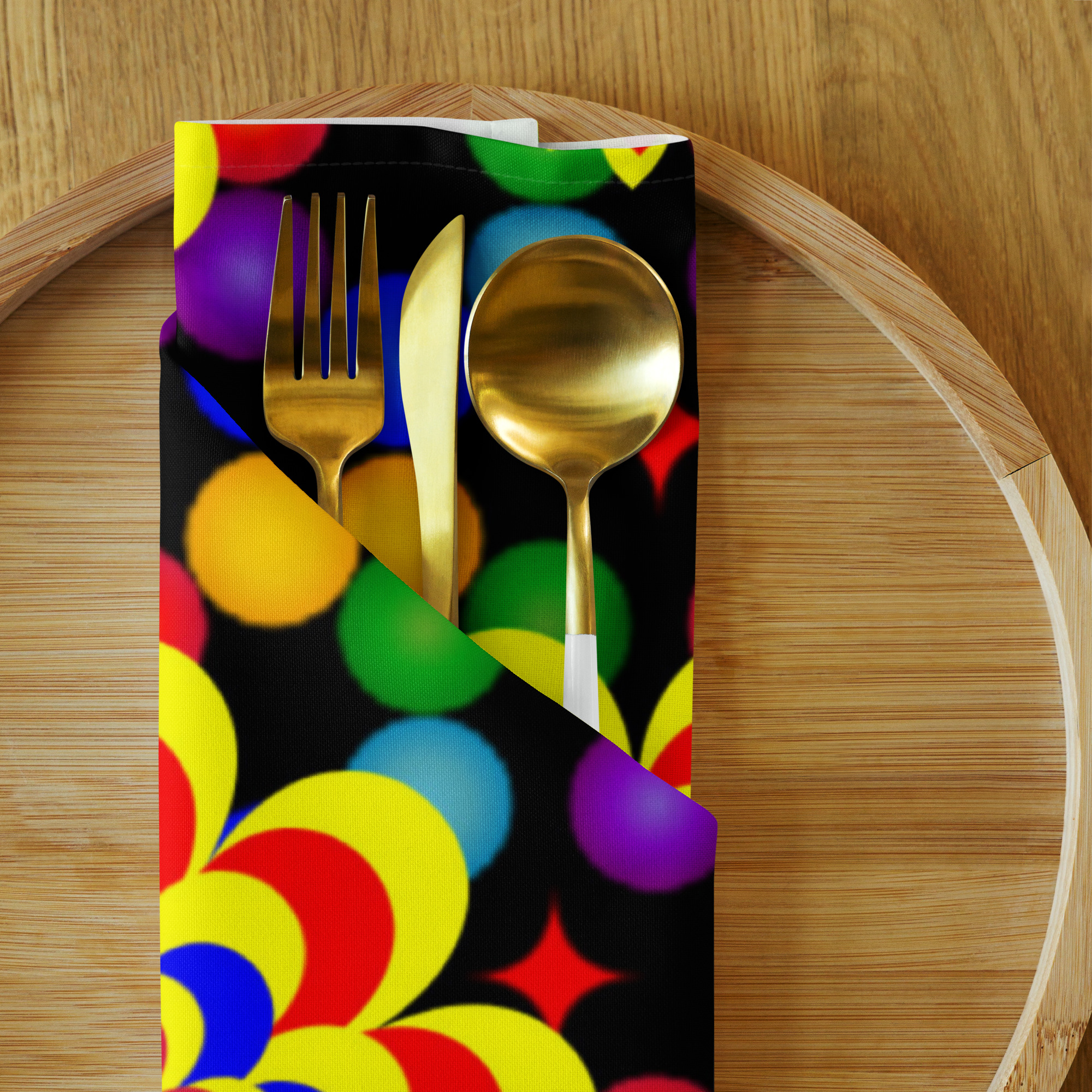 Add a pop of color and whimsy to your table setting with our vibrant cloth napkin set featuring an original art pattern design of yellow, red, and blue balls and flowers. This unique design is sure to bring a touch of personality to your dining experience.