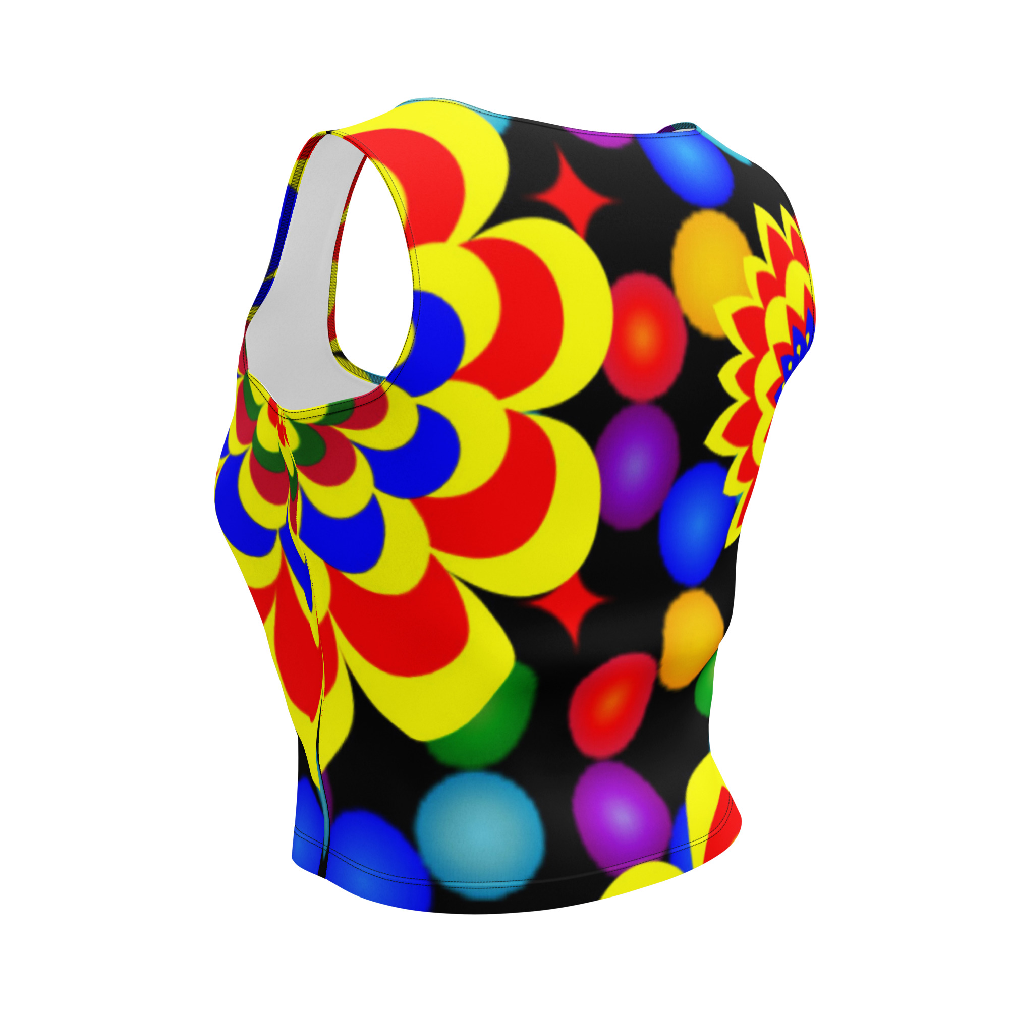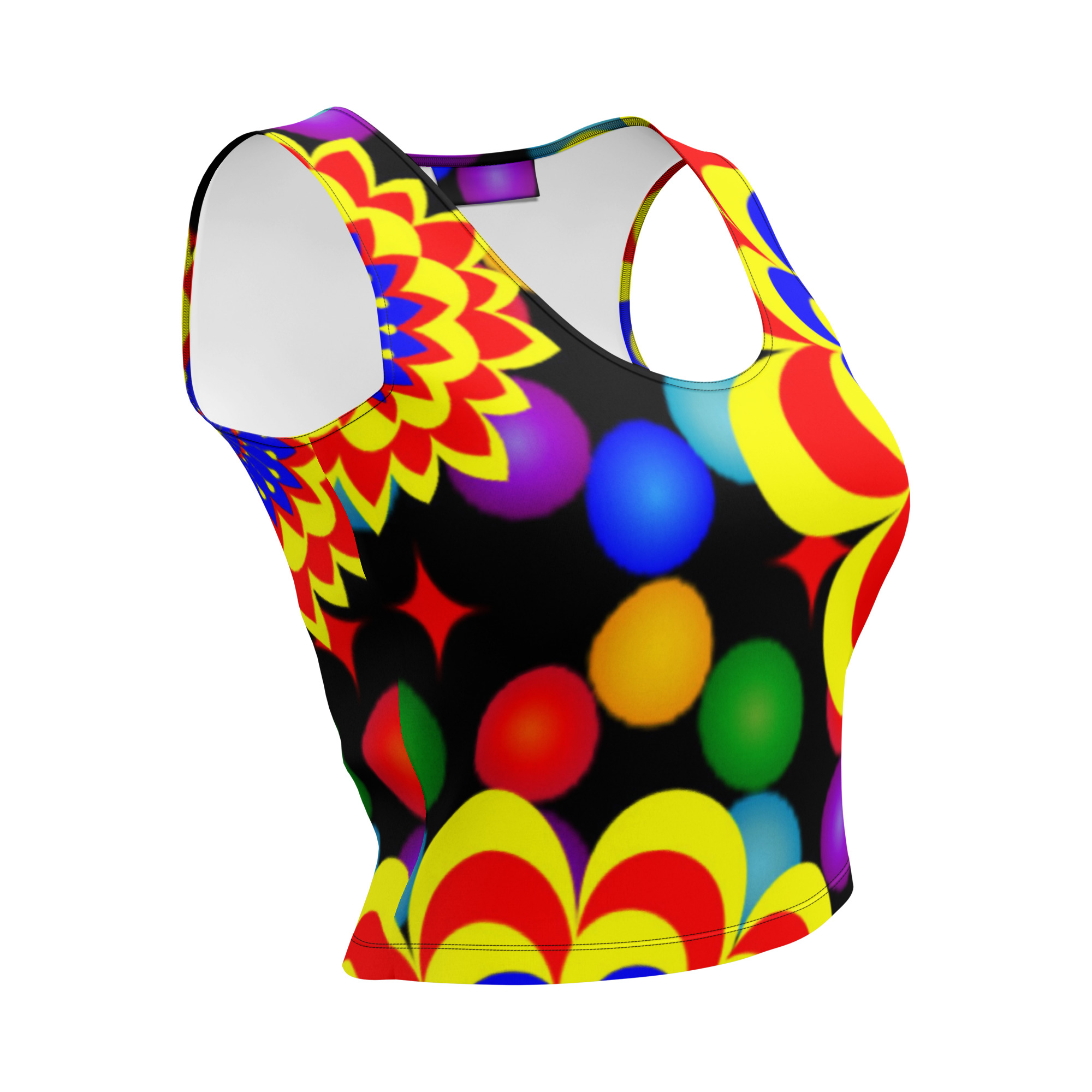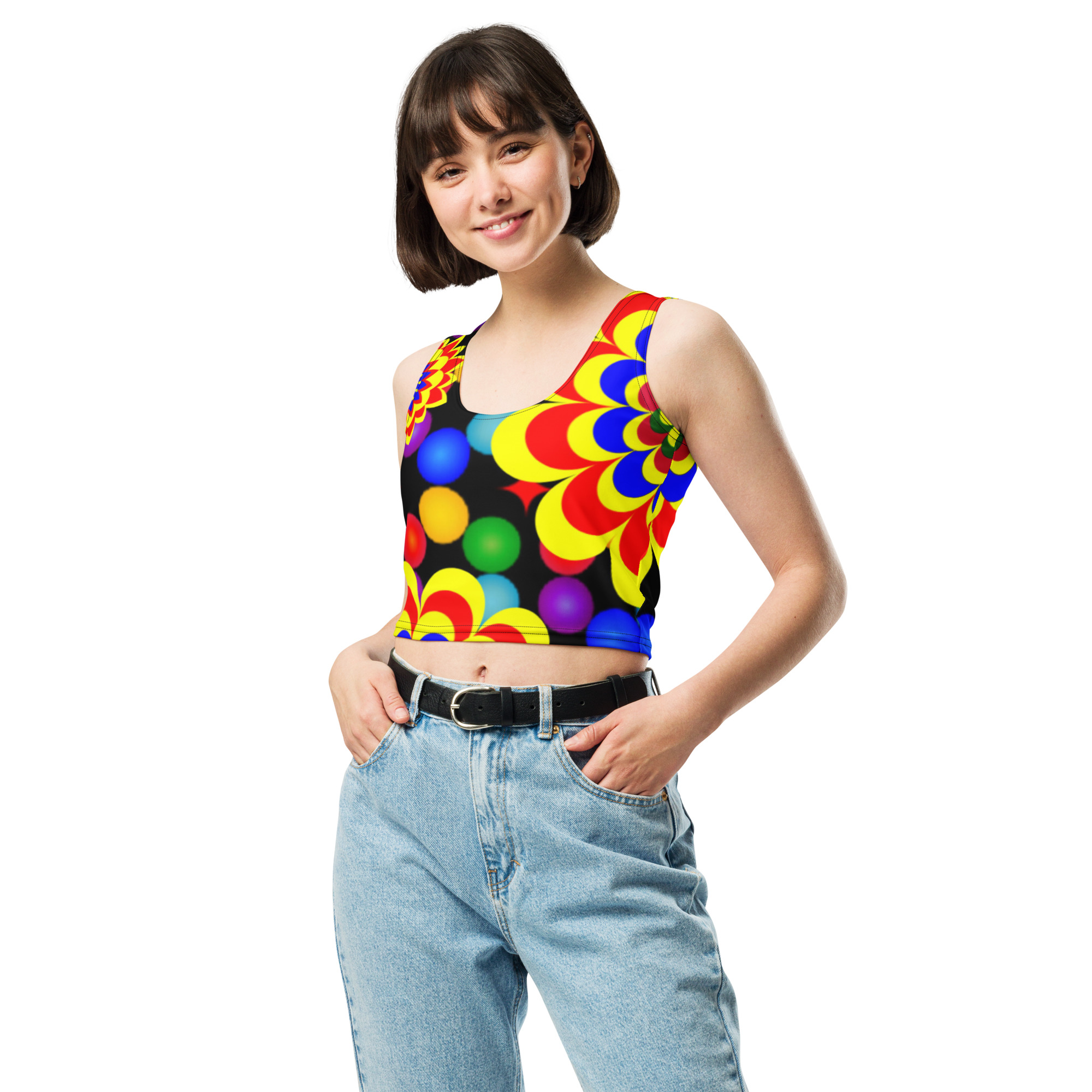 Elevate your wardrobe with our vibrant crop top featuring an original art pattern design of yellow, red, and blue balls and flowers. This unique design is sure to make a statement and showcase your personal style.