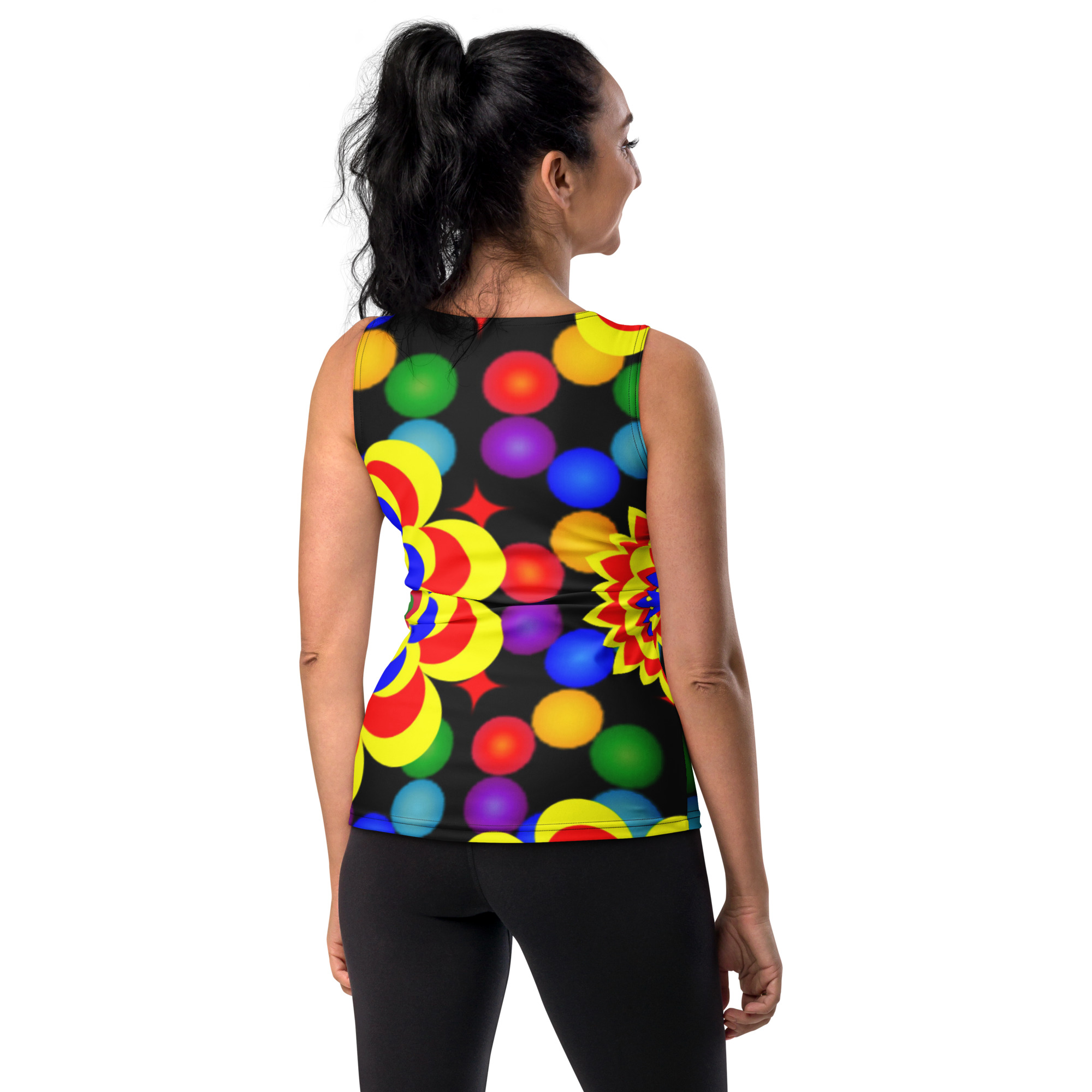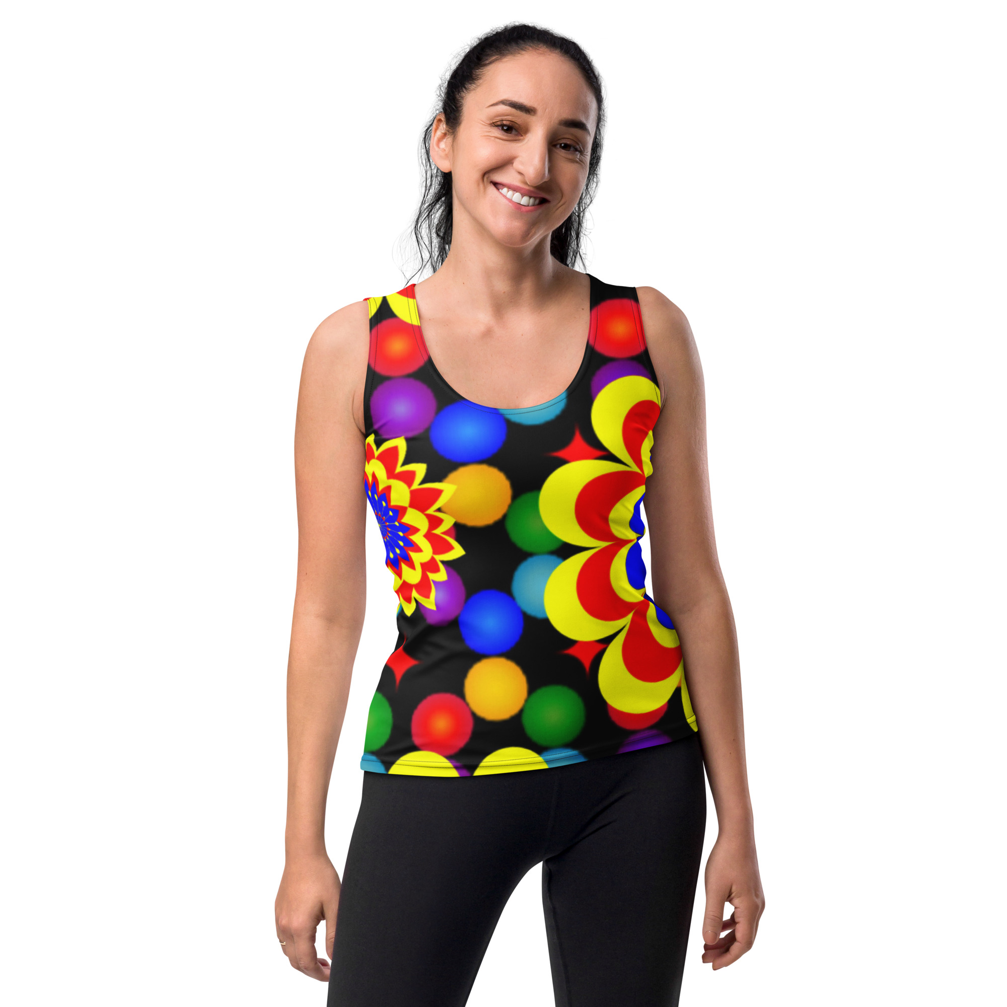 Make a statement with our vibrant cut & sew tank top featuring an original art pattern design of yellow, red, and blue balls and flowers. This unique design is sure to turn heads and showcase your personal style.