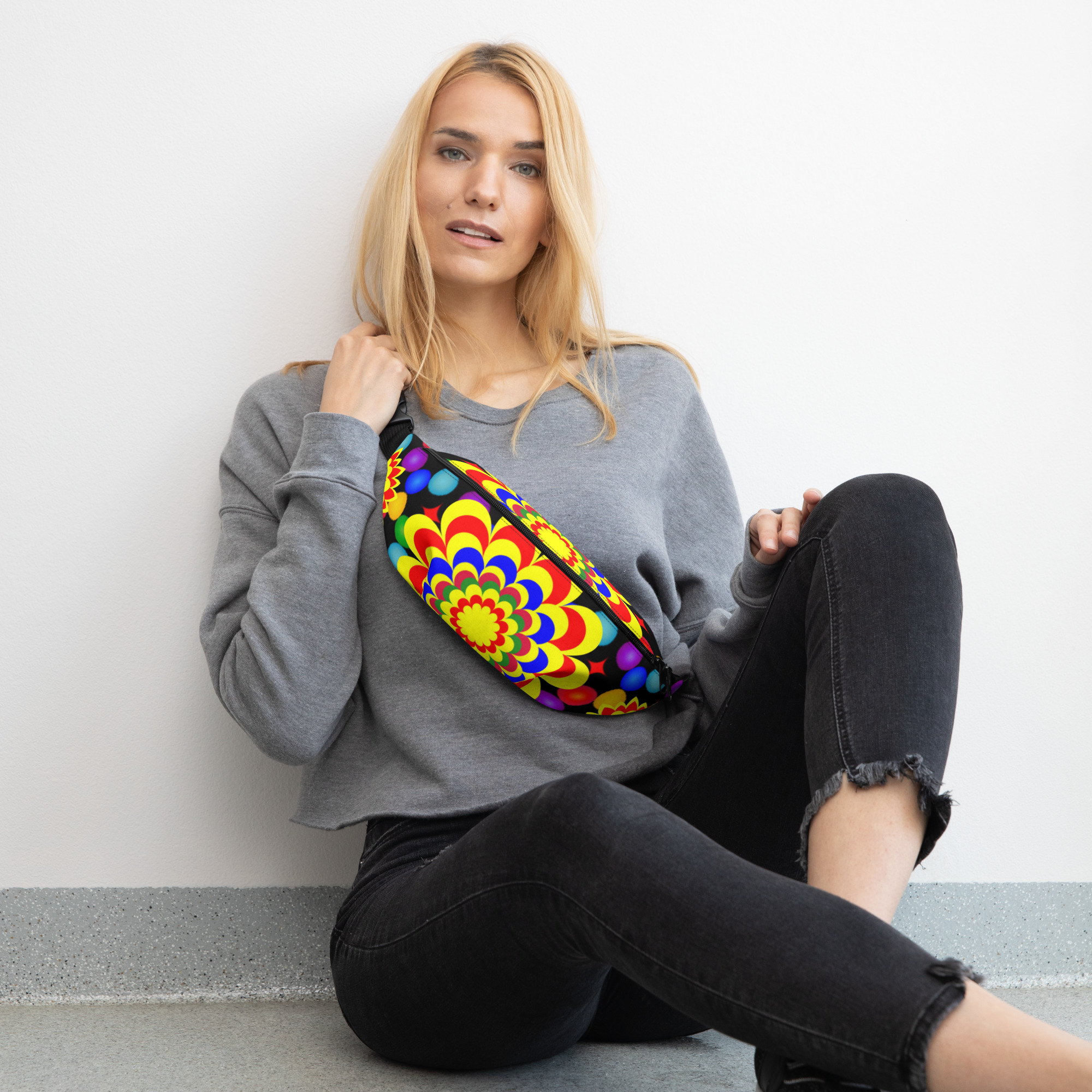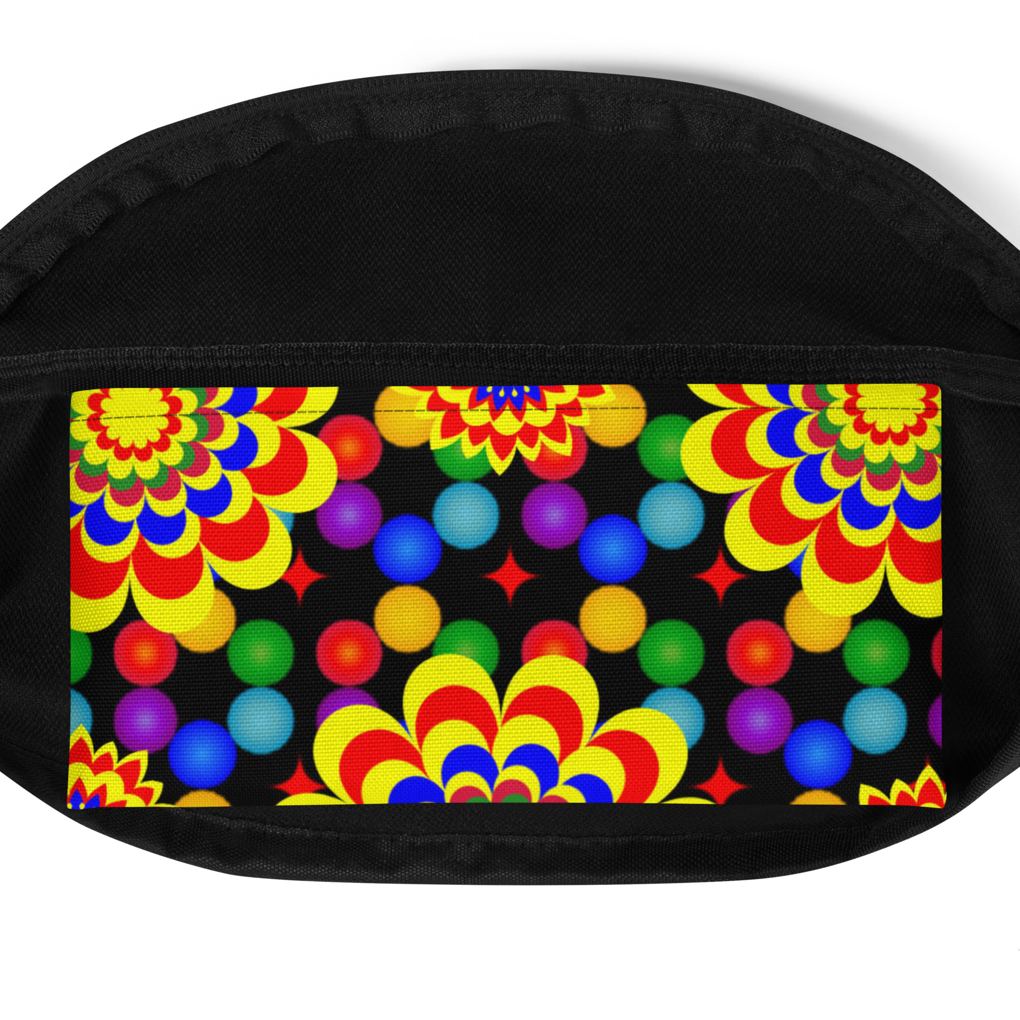Add a fun and functional touch to your outfit with our vibrant fanny pack featuring an original art pattern design of yellow, red, and blue balls and flowers. This unique design combines style and practicality, making it perfect for outdoor activities, travel, or everyday use.