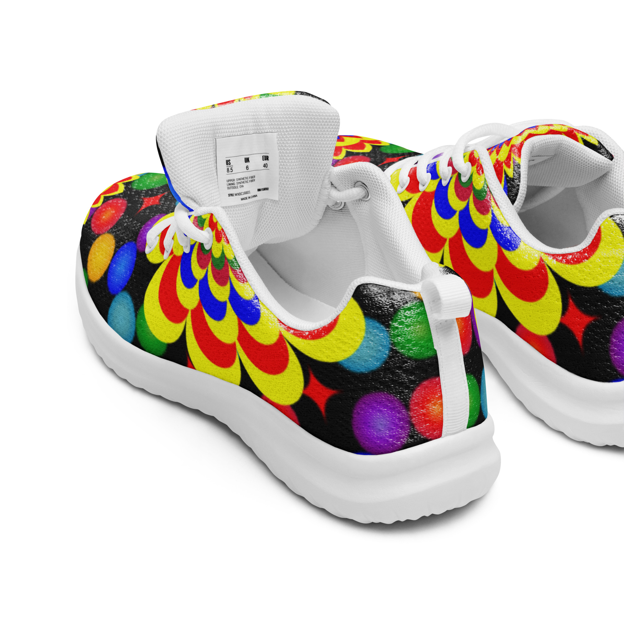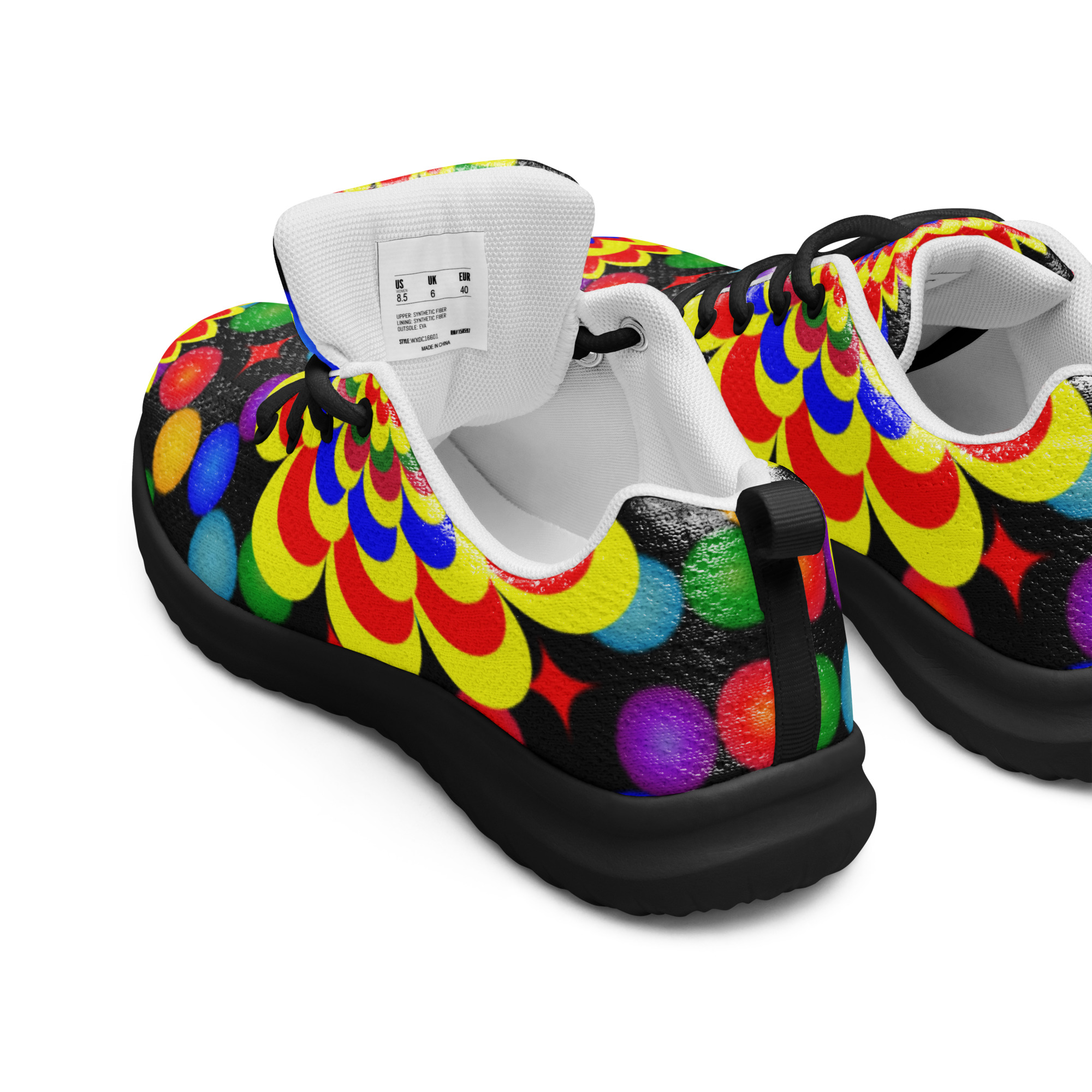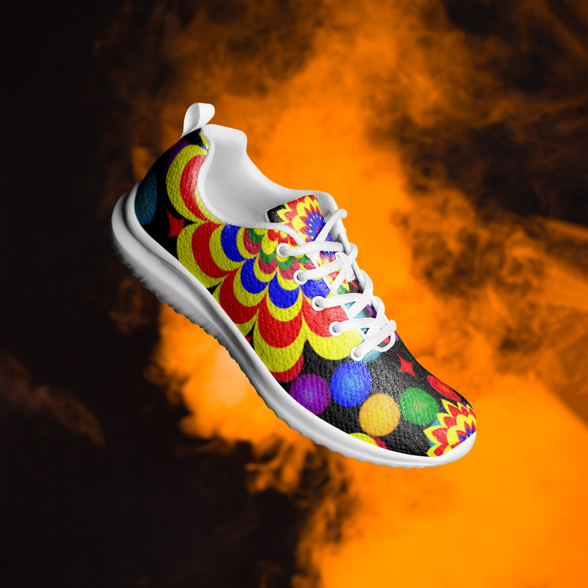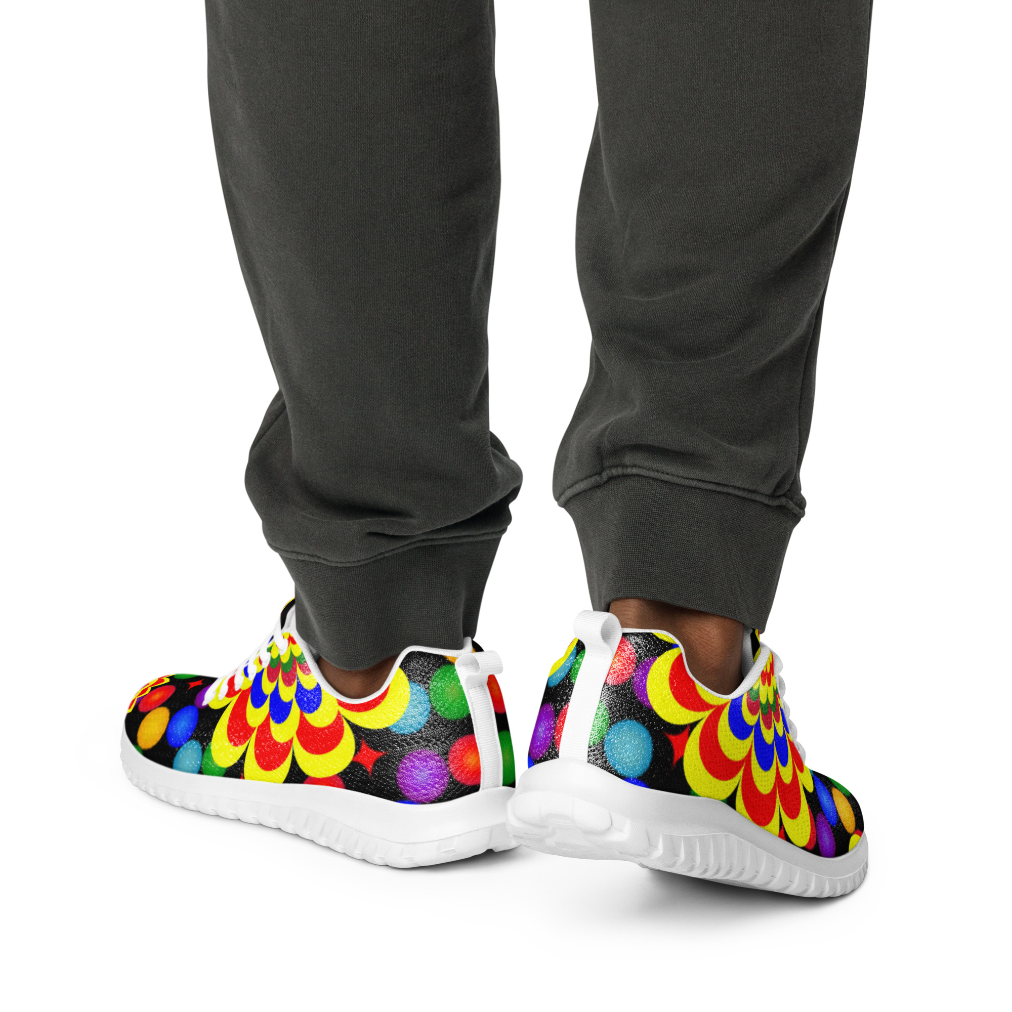 Elevate your fitness game with our vibrant men’s athletic shoes featuring an original art pattern design of yellow, red, and blue balls and flowers. These shoes combine style, comfort, and performance, making them perfect for athletes, fitness enthusiasts, and anyone who wants to add a pop of personality to their workout gear.