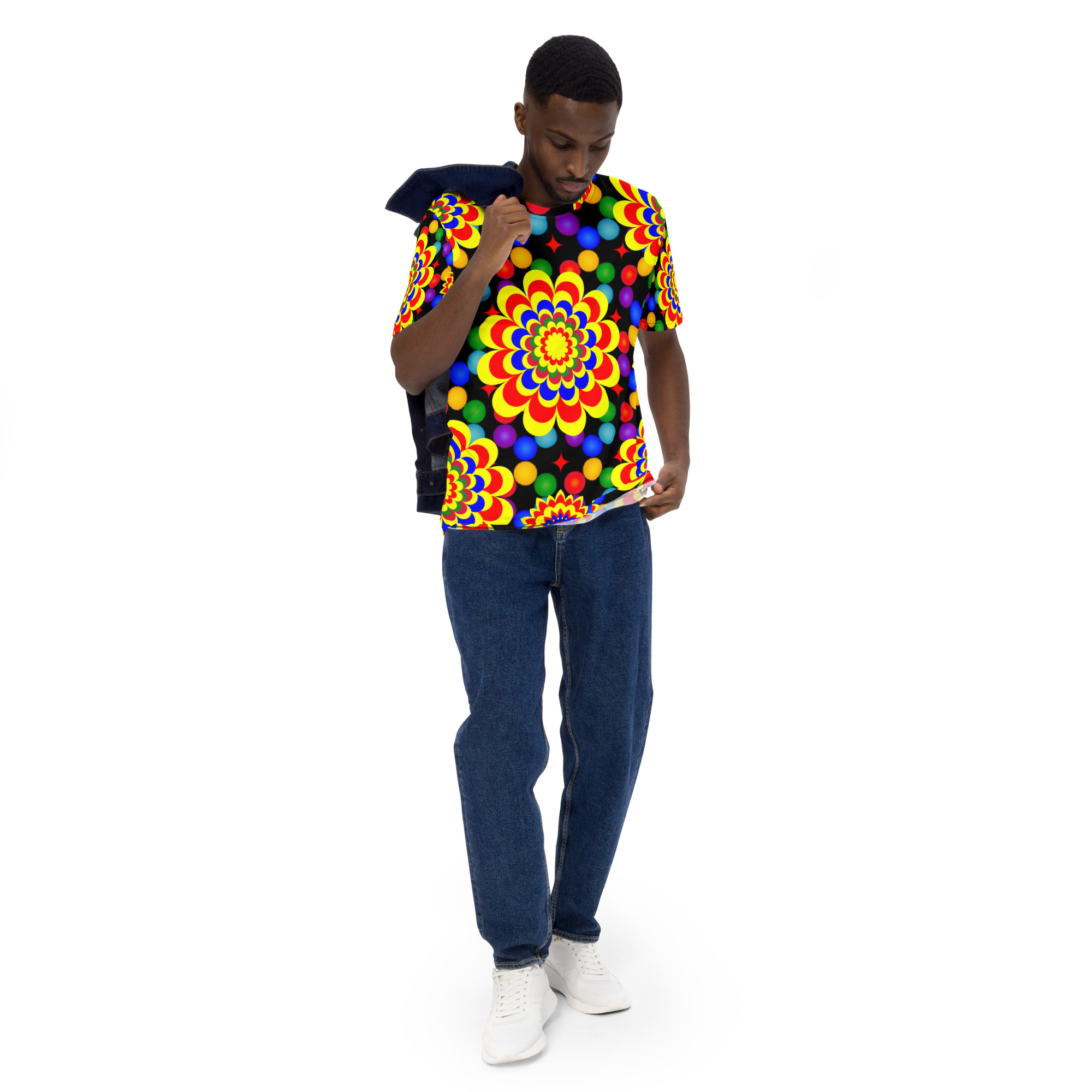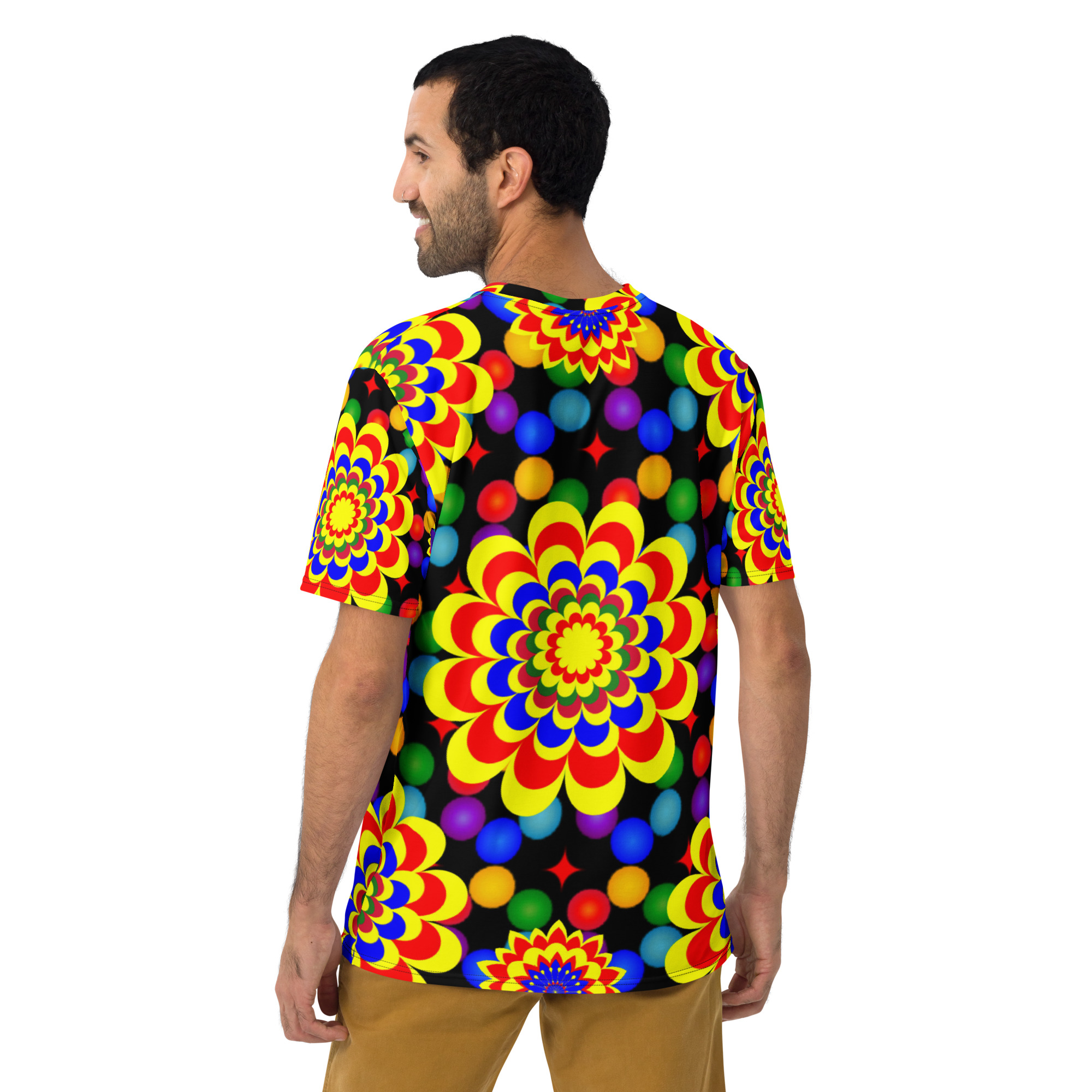 Elevate your wardrobe with our vibrant men’s T-shirt featuring an original art pattern design of yellow, red, and blue balls and flowers. This unique design combines style, comfort, and individuality, making it perfect for fashion enthusiasts and anyone who wants to stand out.