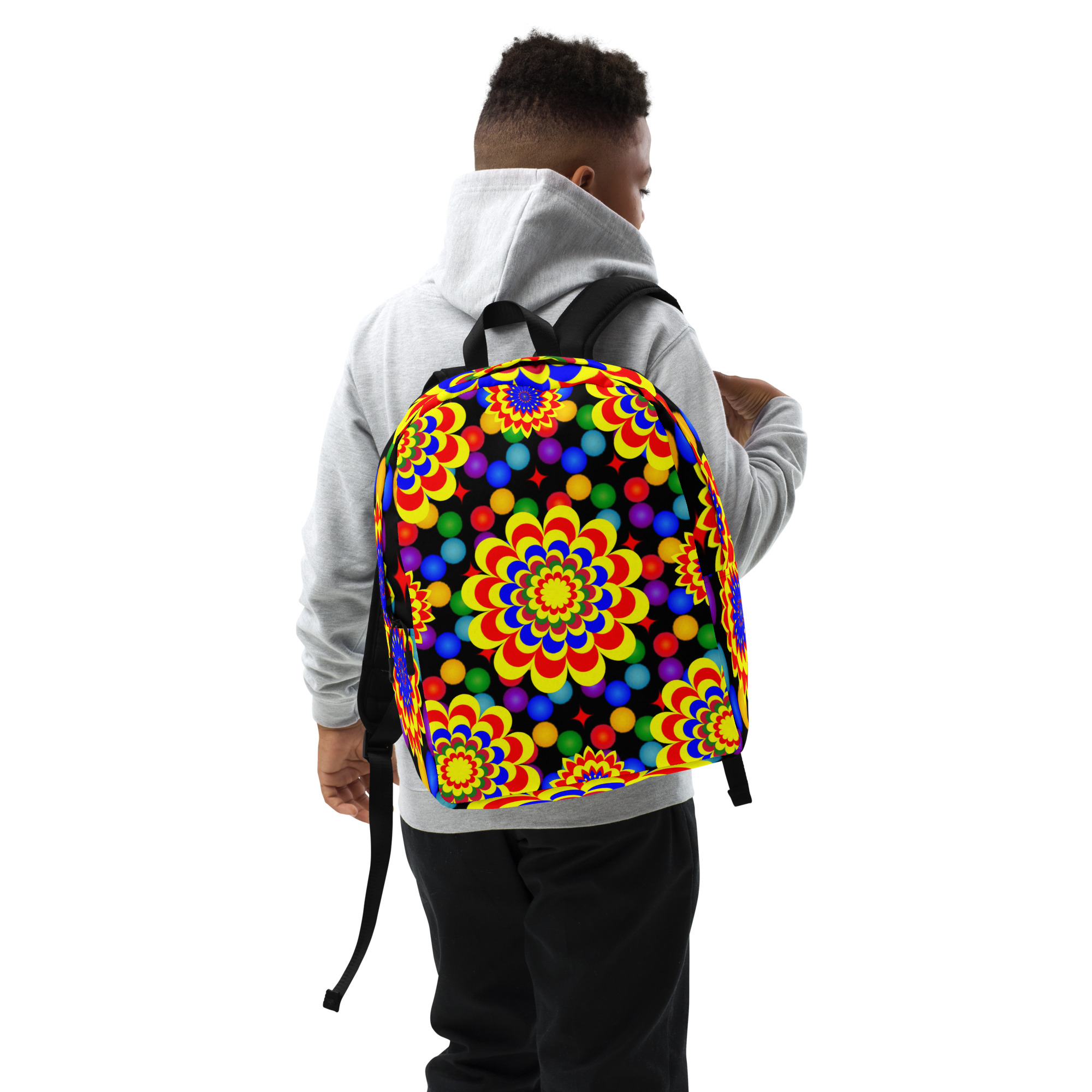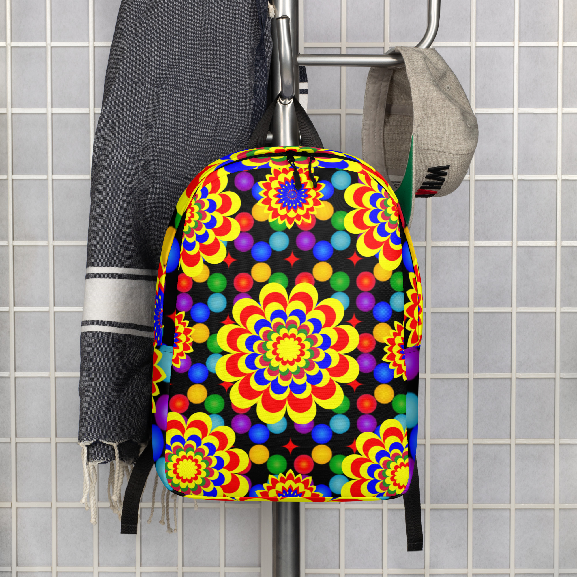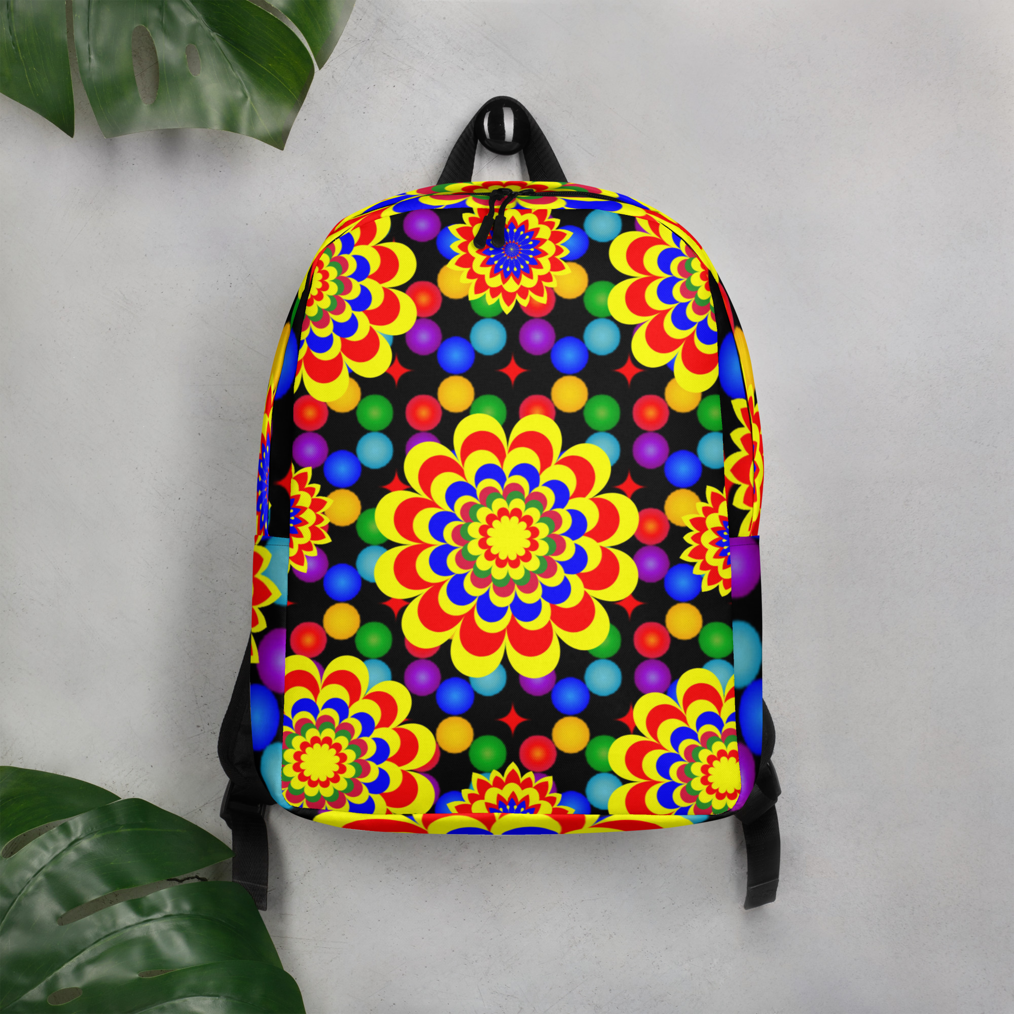 *Original Art Yellow, Red, and Blue Ball and Flowers Pattern Design on Minimalist Backpack*