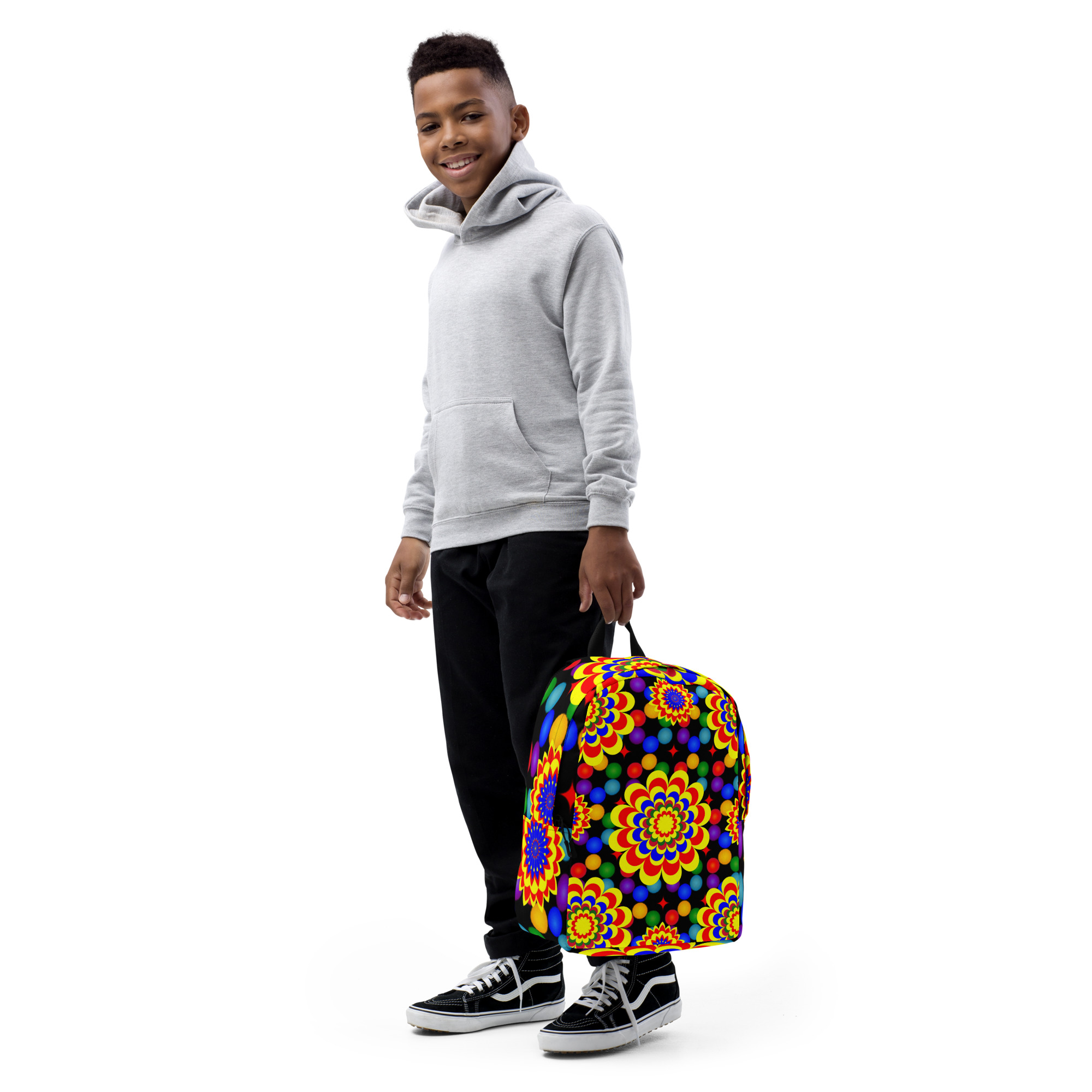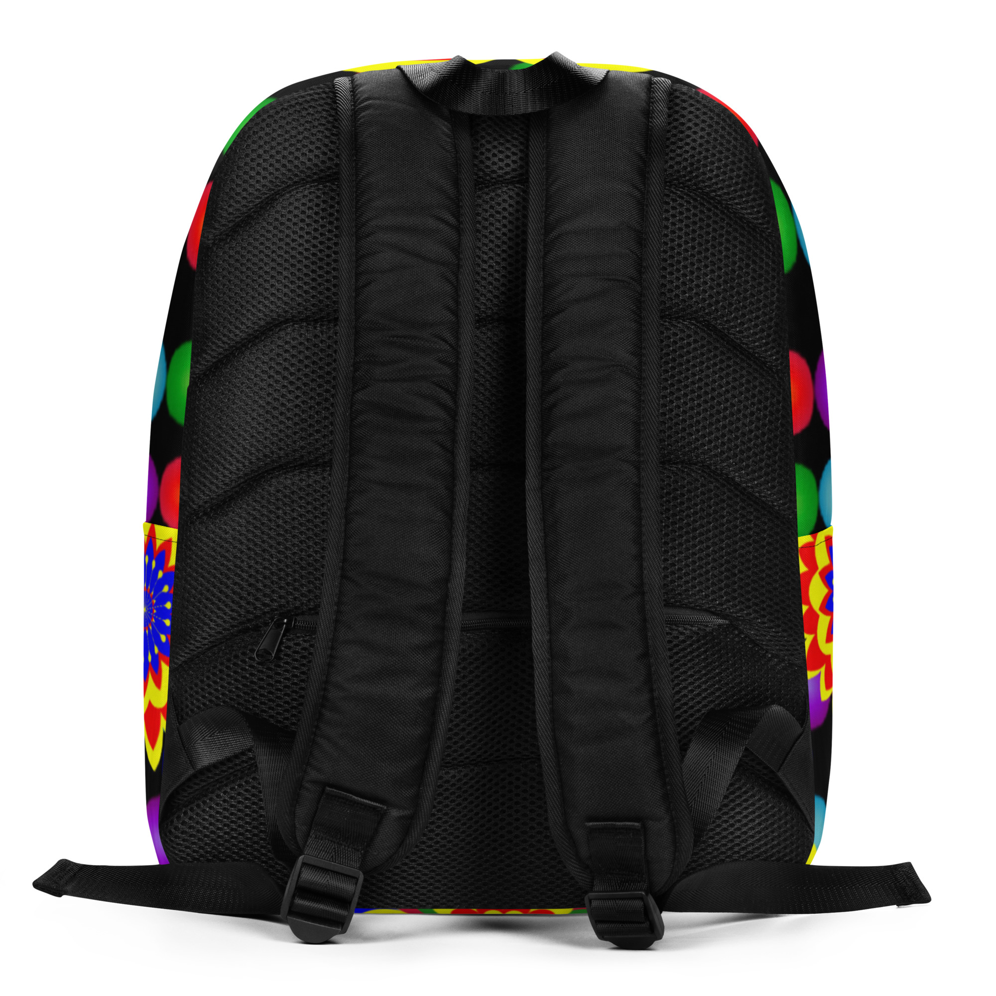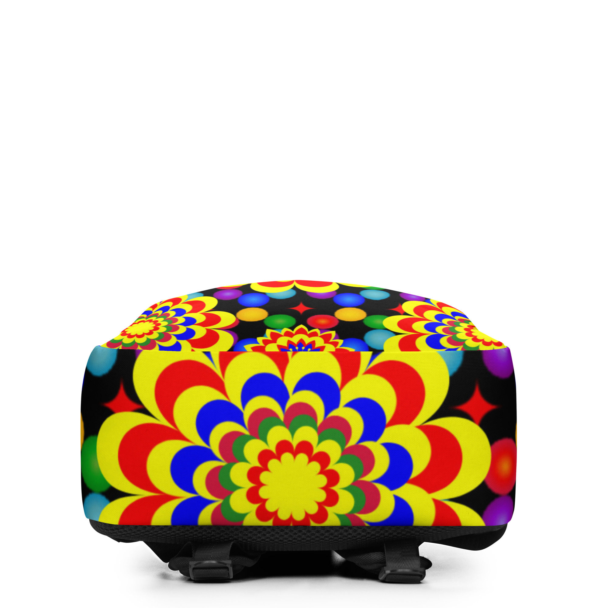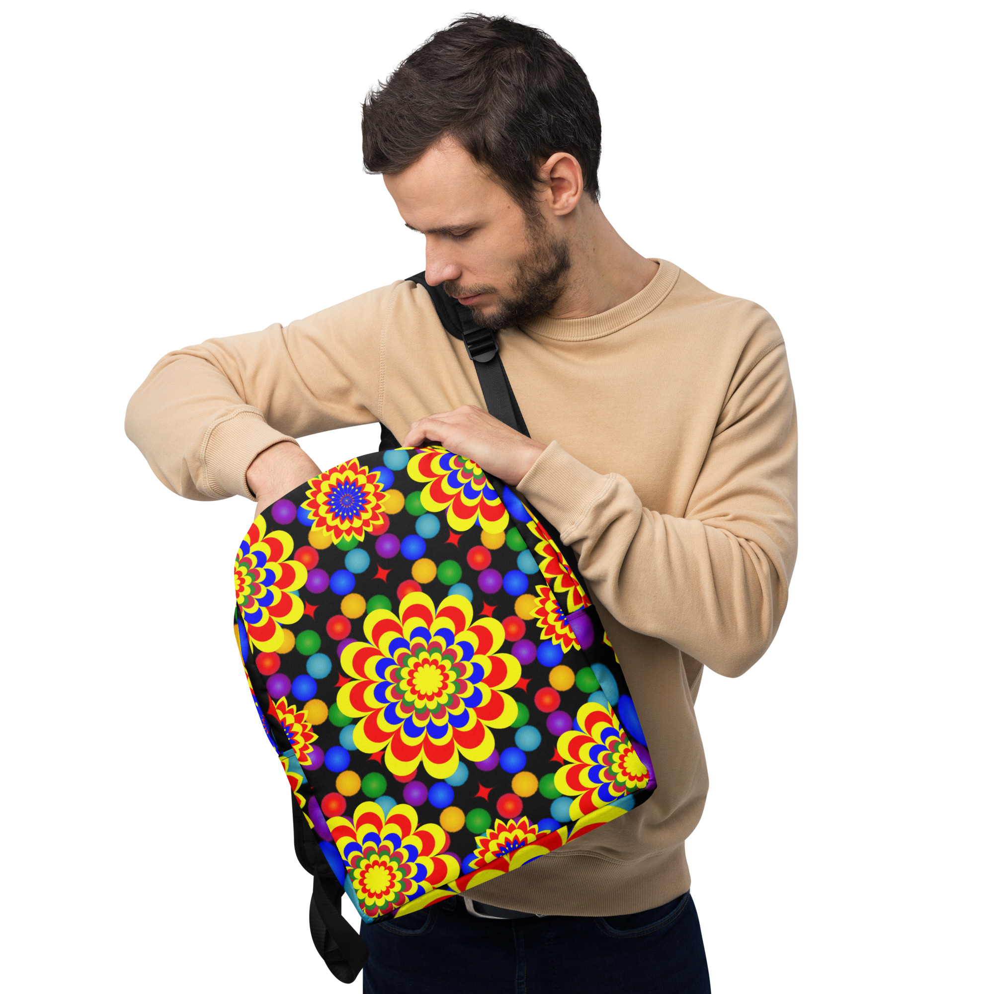 *Original Art Yellow, Red, and Blue Ball and Flowers Pattern Design on Minimalist Backpack*