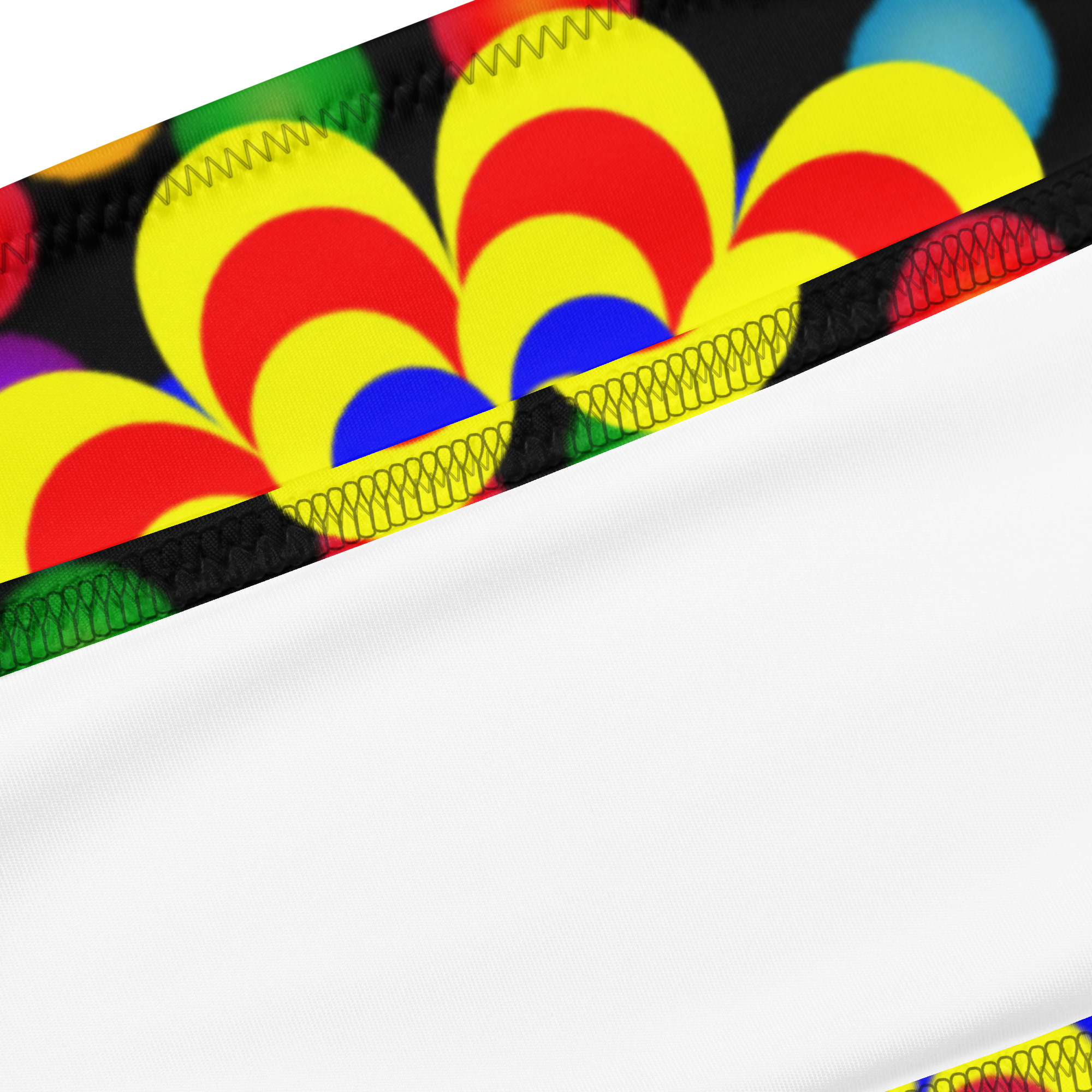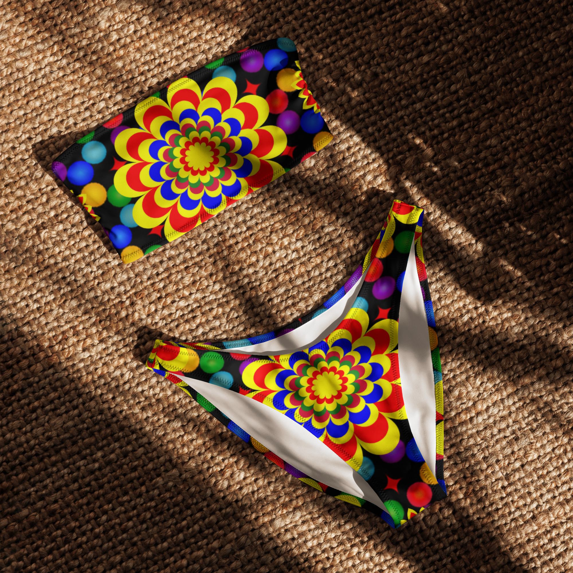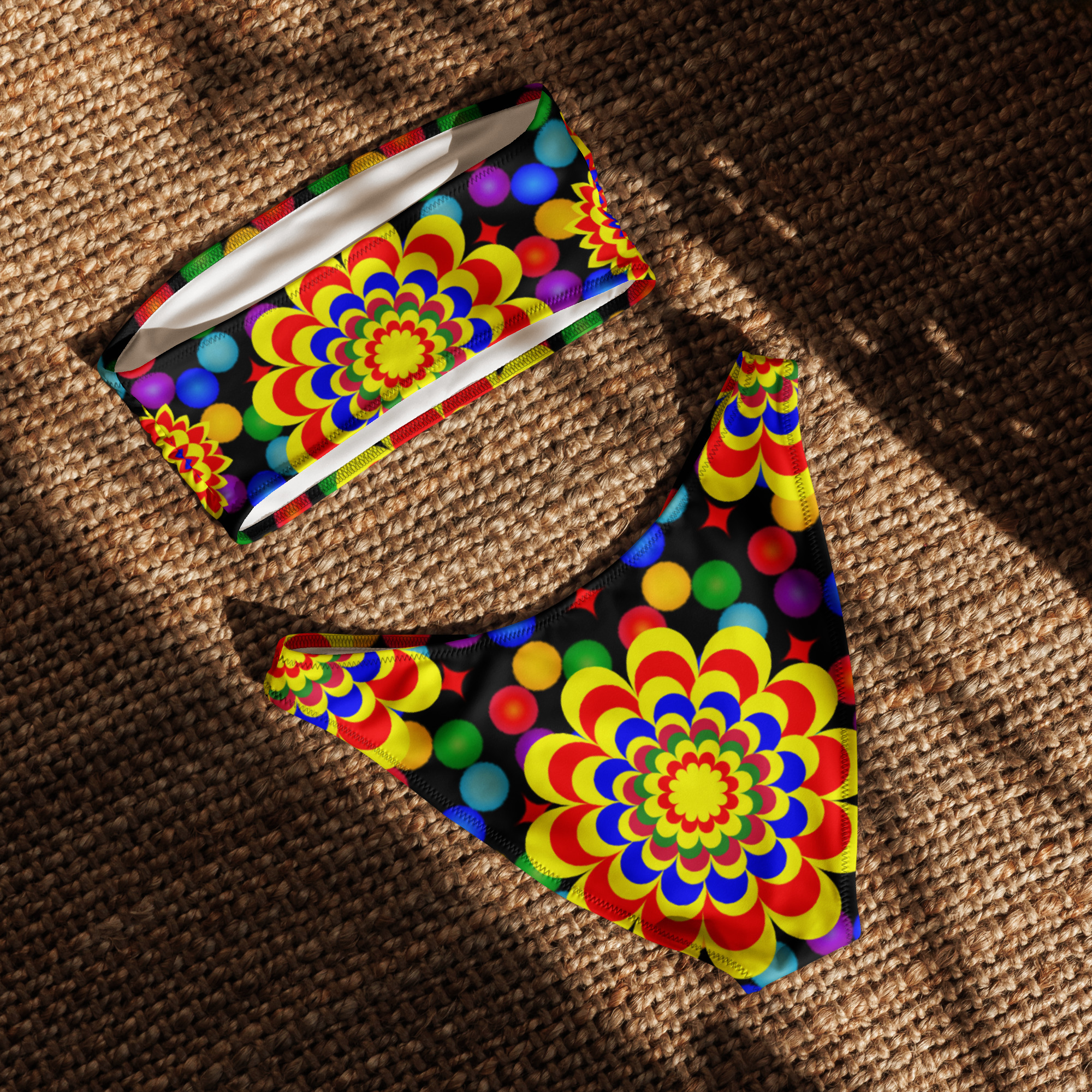 Make a splash in our vibrant recycled bandeau bikini featuring an original art pattern design of yellow, red, and blue balls and flowers. This unique design combines style, comfort, and sustainability, making it perfect for eco-conscious beachgoers and fashion enthusiasts.