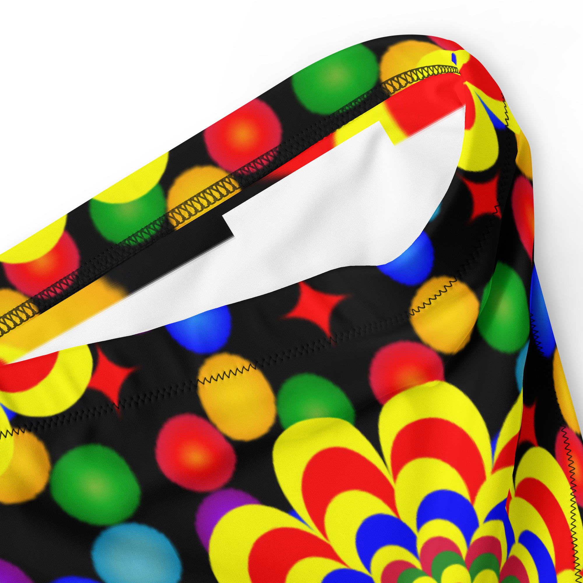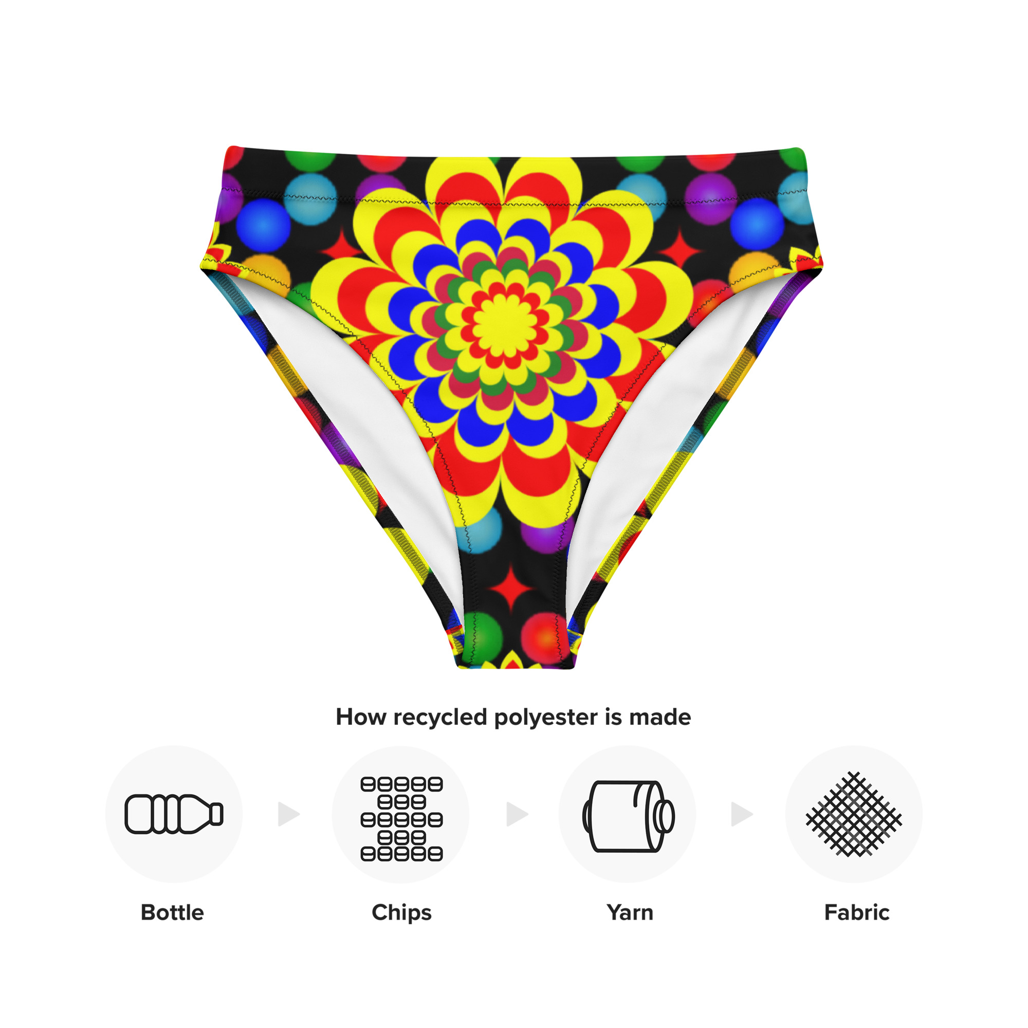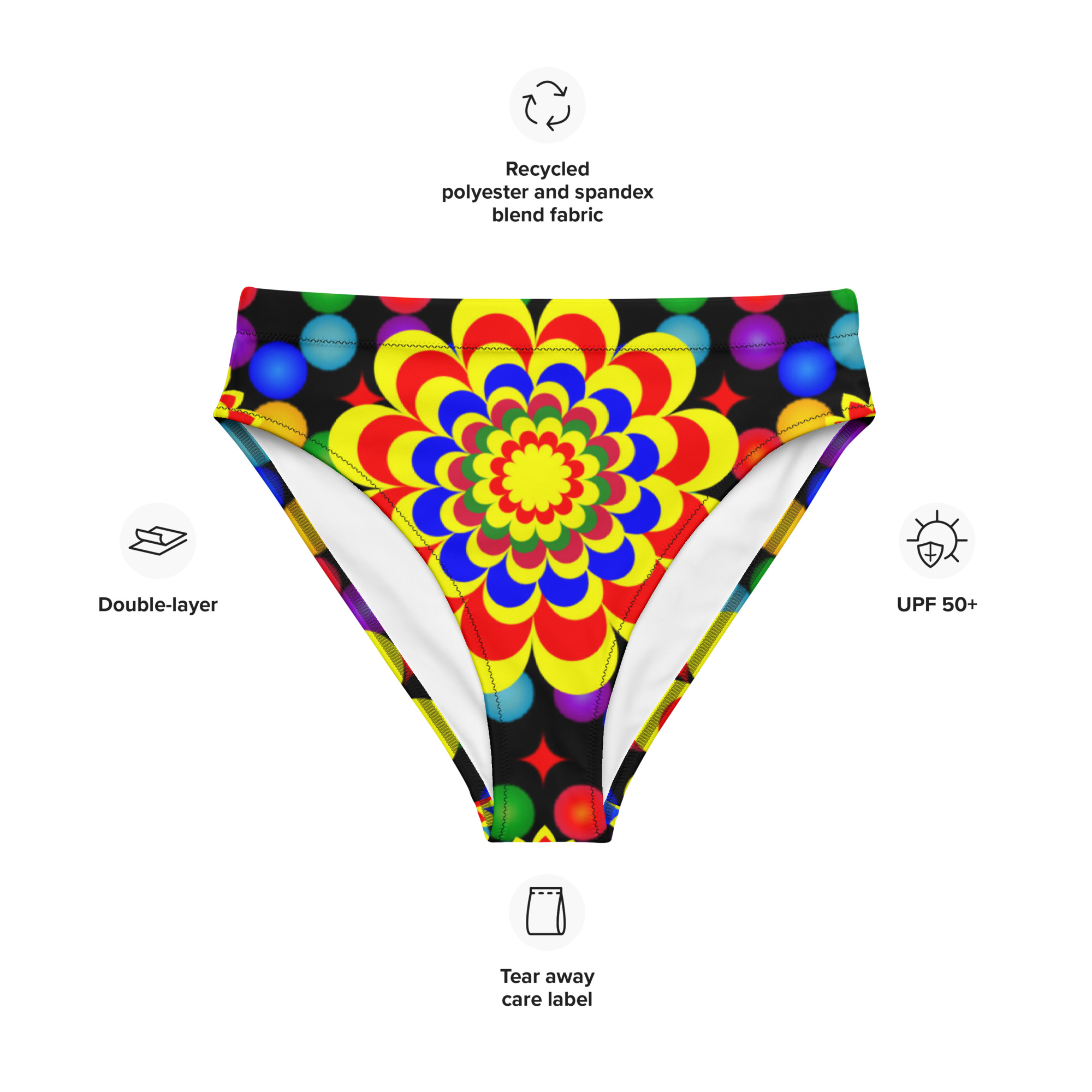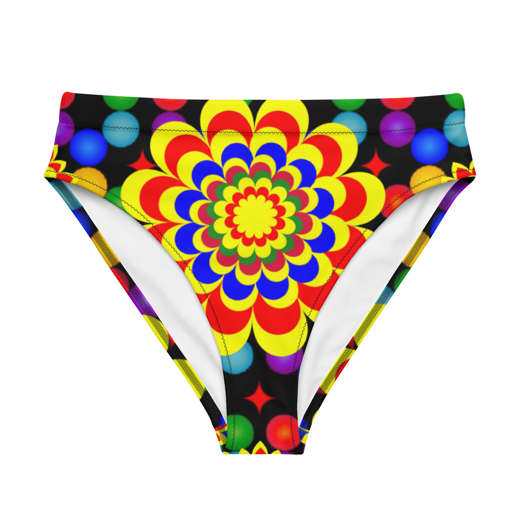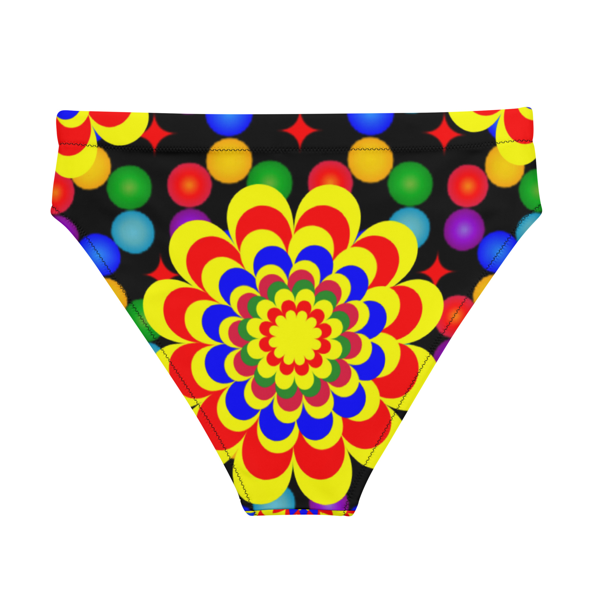 Elevate your beach style with our high-waisted bikini bottom featuring an original art pattern design of yellow, red, and blue balls and flowers. This unique design is sure to make a statement and provide a comfortable, confident fit.