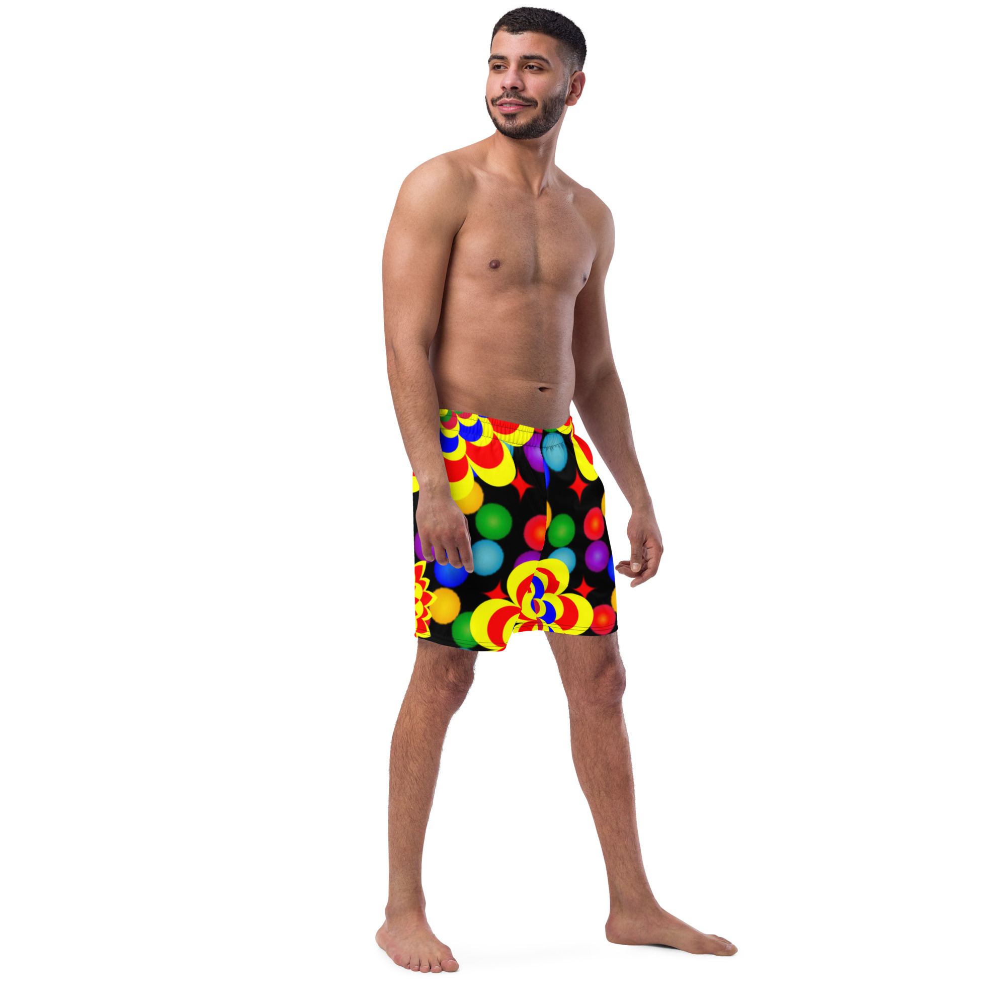 Dive into style and sustainability with our vibrant recycled swim trunks featuring an original art pattern design of yellow, red, and blue balls and flowers. These eco-friendly swim trunks combine comfort, functionality, and unique design, making them perfect for beachgoers, pool enthusiasts, and anyone who prioritizes sustainability.