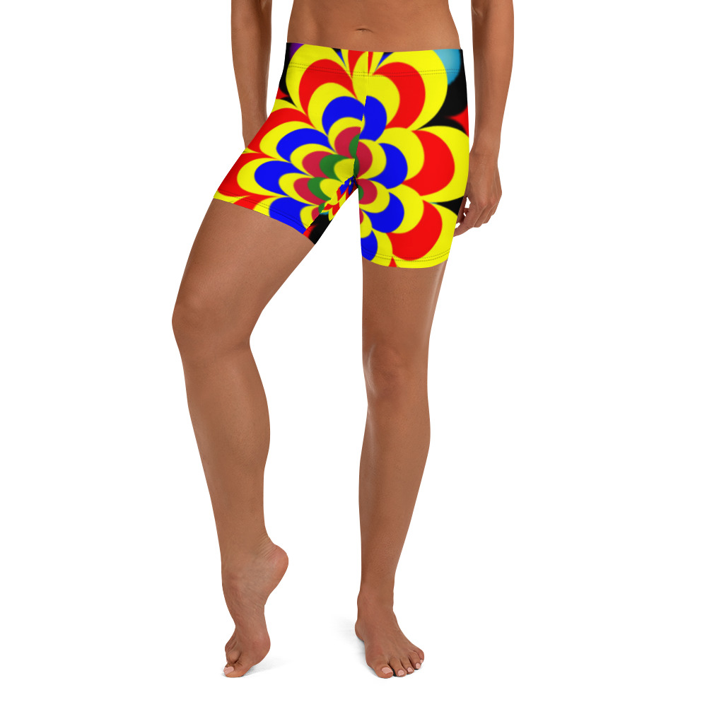 *Original Art Yellow, Red, and Blue Ball and Flowers Pattern Design on Shorts*