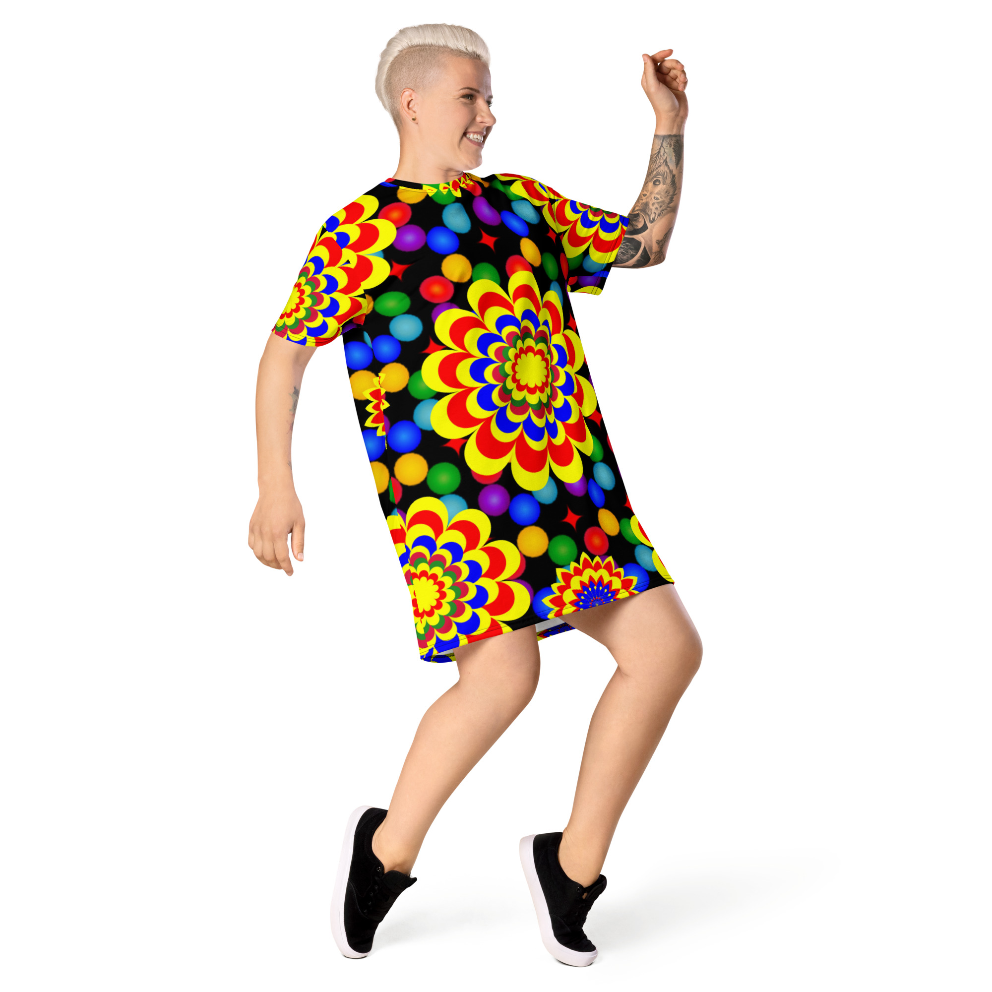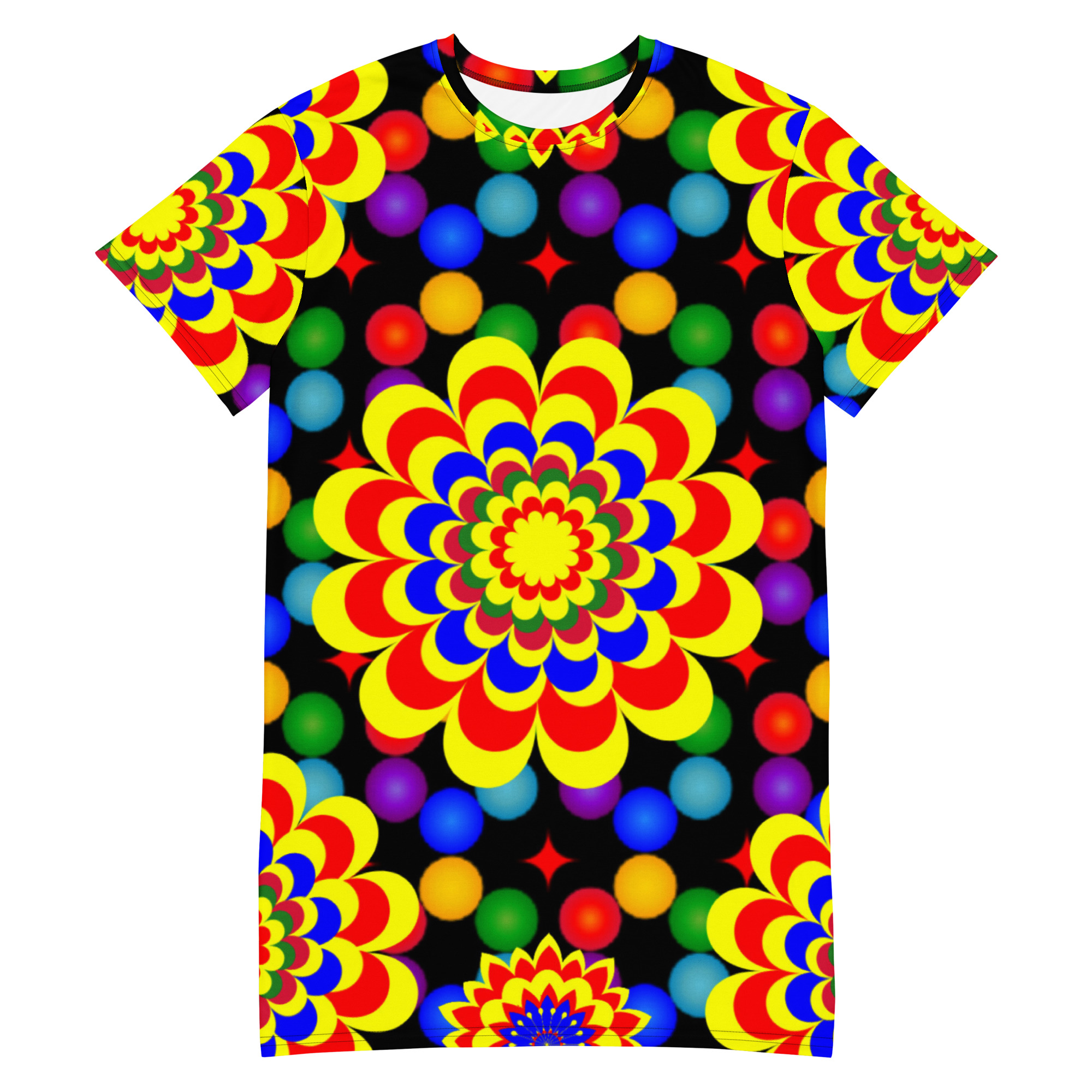 Make a statement with our vibrant t-shirt dress featuring an original art pattern design of yellow, red, and blue balls and flowers. This unique design combines playful colors and whimsical patterns, creating a truly eye-catching piece.