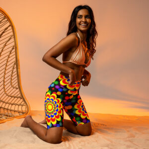 *Original Art Yellow, Red, and Blue Ball and Flowers Pattern Design on Shorts*