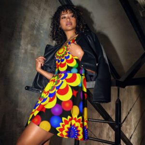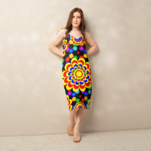 *Original Art Yellow, Red, and Blue Ball and Flowers Pattern Design on Tie-Trap Midi Dress*