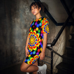 *Origina Art Yellow, Red, and Blue Ball and Flowers Pattern Design on T-Shirt Dress*