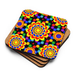 *Original Art Yellow, Red, and Blue Ball and Flowers Pattern Design on Cork-Back Coaster*