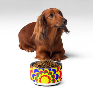 *Original Art Yellow, Red, and Blue Ball and Flowers Pattern Design on Pet Bowl*